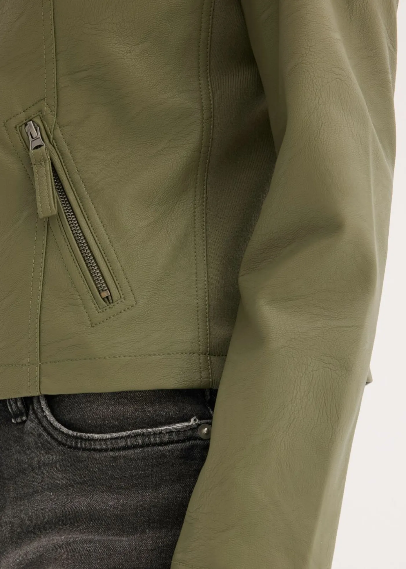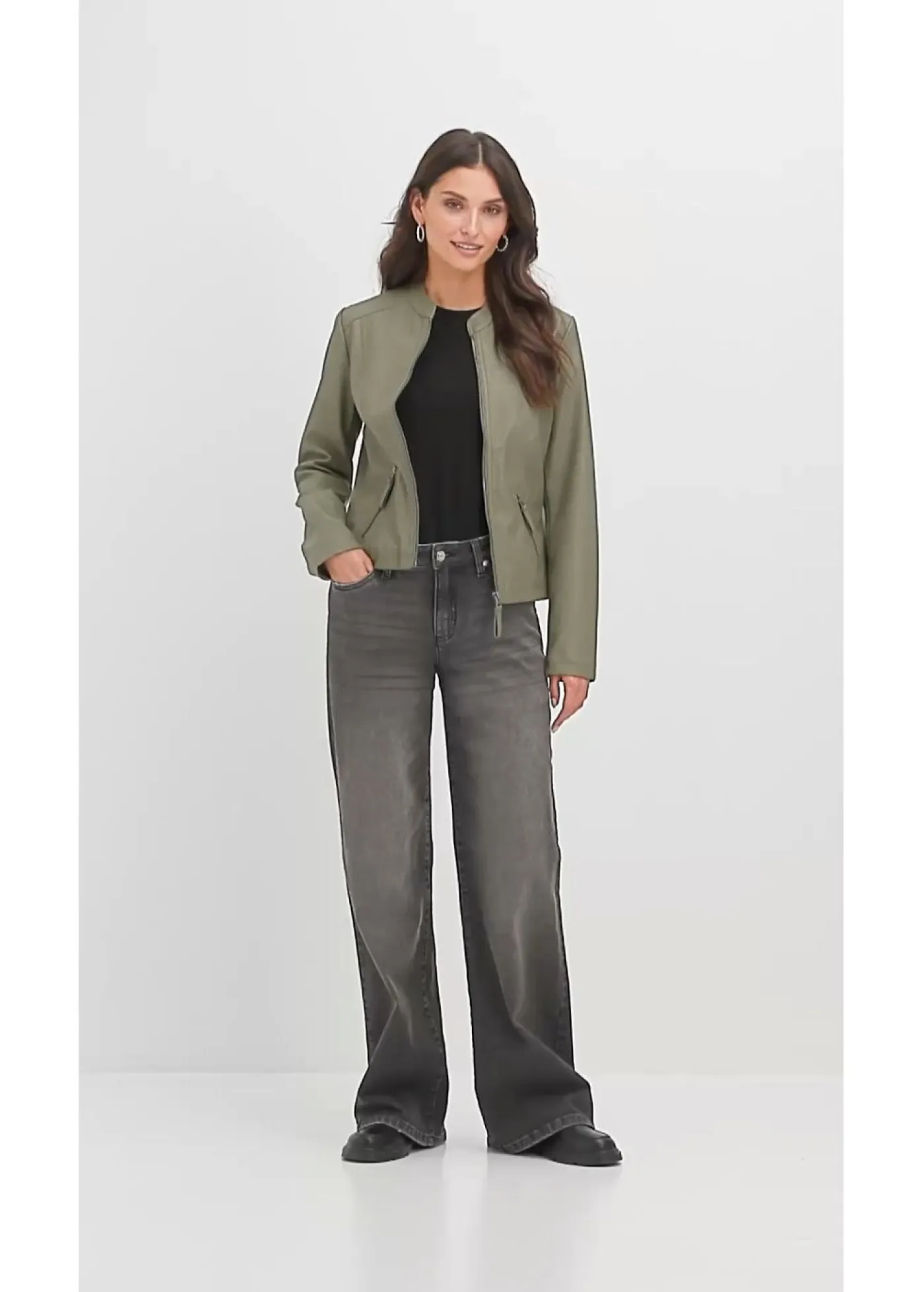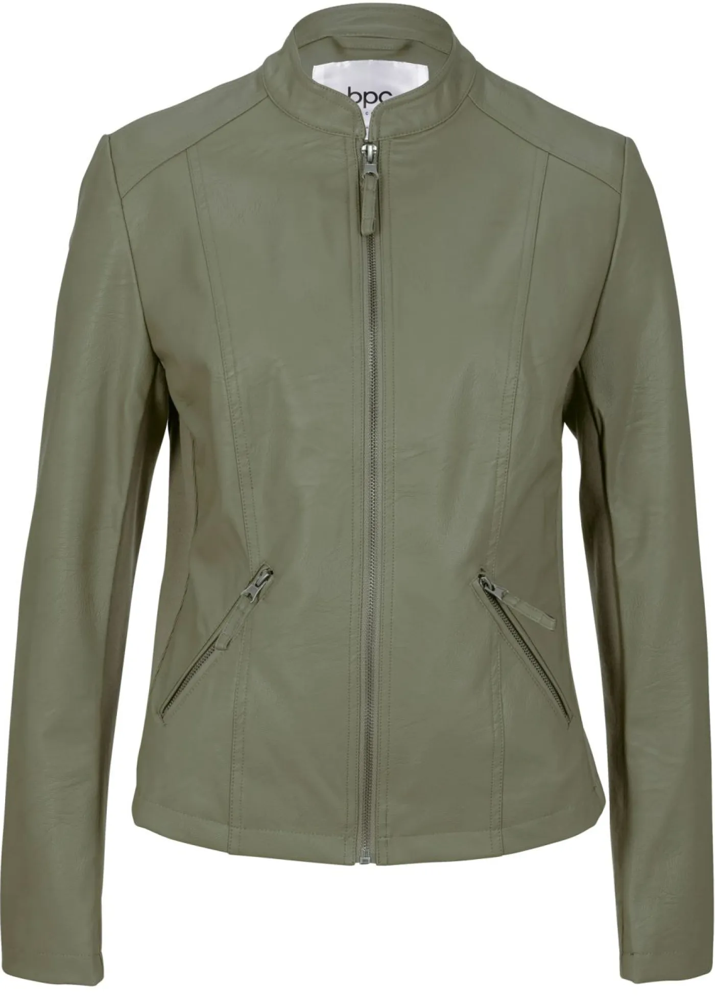 Elegante chaqueta de piel sintética con cuello alto, entallada. Largo de aprox. 54 cm (talla 38) a aprox. 67 cm (talla 56). Se puede lavar a máquina.