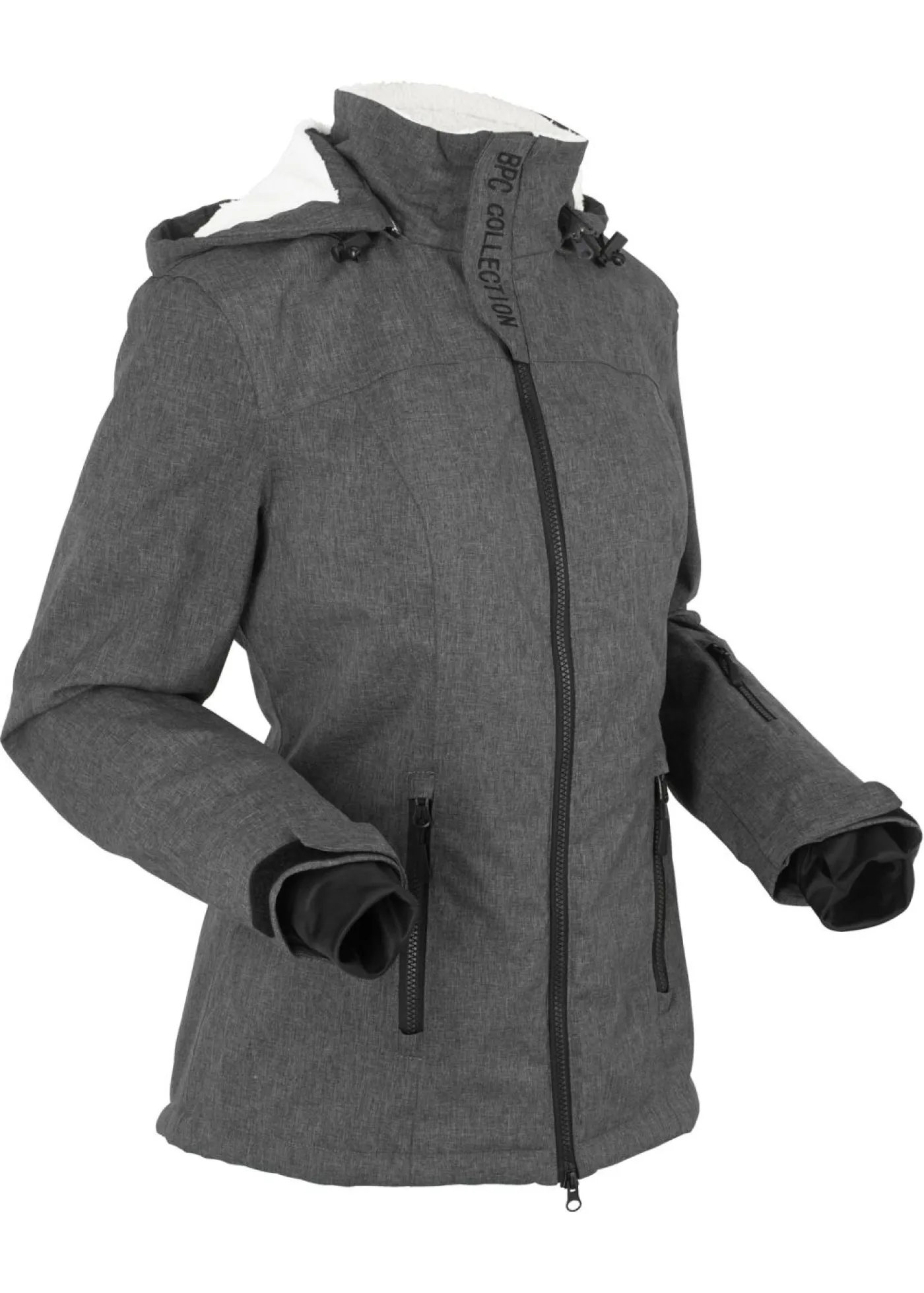 Atractiva chaqueta de lluvia con bolsillos con cremallera. Con capucha desmontable, interior de forro polar, cordón en el dobladillo para ajustar la anchura, bolsillo interior con cordón, orificios para los pulgares, más largo en la parte posterior que en la delantera. Columna de agua de 3000 mm. Largo de aprox. 74 cm en talla 42.