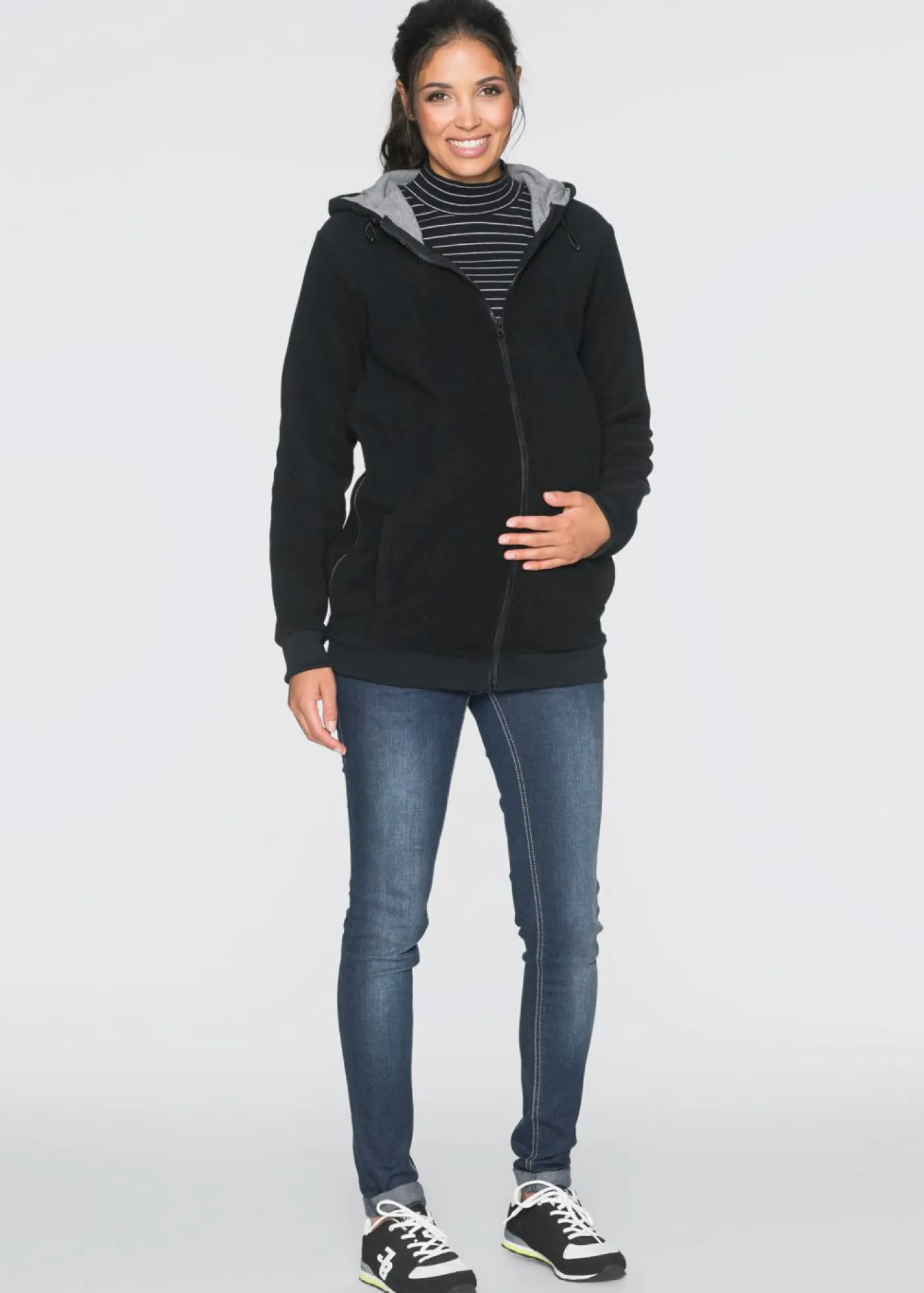 Agradable chaqueta premamá con inserto de porteo con detalles bonitos. La chaqueta premamá polar dispone de cremalleras laterales que crean un ancho adicional durante el embarazo. Después del embarazo, la chaqueta de tejido polar también se puede usar como transporte con una correa que ayude al inserto para bebés. El inserto para bebés es solo para protección, no tiene función de transporte. Con esta chaqueta de maternidad, las futuras madres encontrarán una prenda fiable y variada para su cómodo aspecto diario, ya sea como un ligero forro polar para los días más cálidos o para sentirse cómoda bajo una chaqueta de otoño.