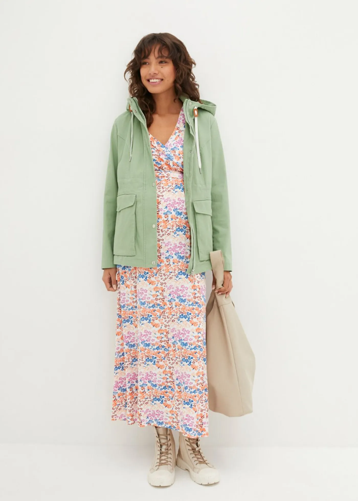 Chaqueta premamá de ancho ajustable hecha de algodón con inserción para bebés. La ligera chaqueta de maternidad es un complemento práctico para la primavera. Con el inserto para bebés, el pequeño queda protegido del viento y la lluvia. Incluso antes del nacimiento, la práctica chaqueta puede llevarse en todos los meses de embarazo, ya que se puede extender con las cremalleras laterales. La chaqueta de maternidad se puede cerrar con una cremallera y botones en la parte delantera. El forro a rayas de la chaqueta de entretiempo atrae todas las miradas. El inserto es solo para protección, no tiene función de porteo.