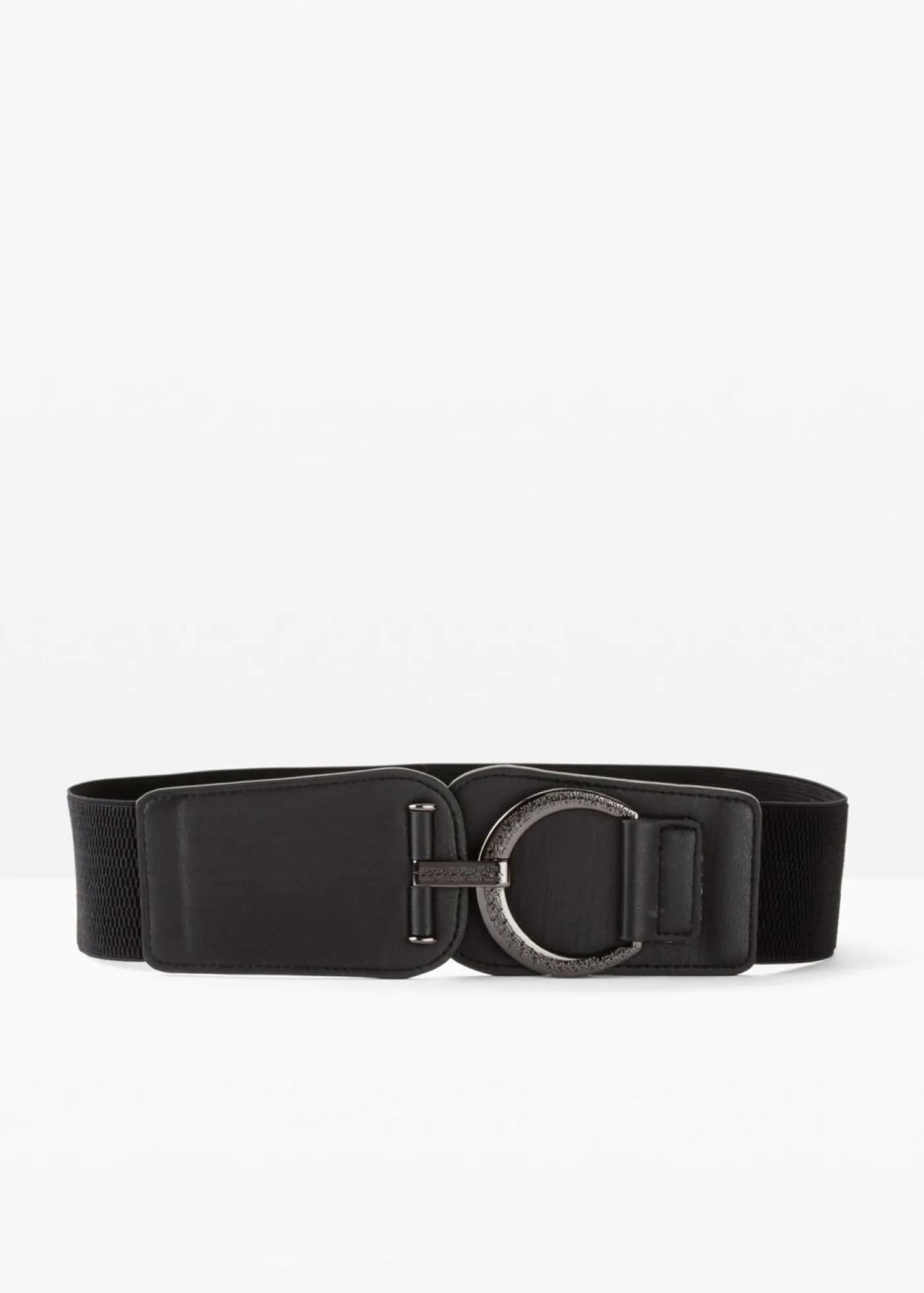 Cinturón elástico elegante con hebilla grande. Cinturón elástico con cierre grande. La hebilla está decorada con un patrón decorativo. El cinturón se puede combinar de muchas maneras.