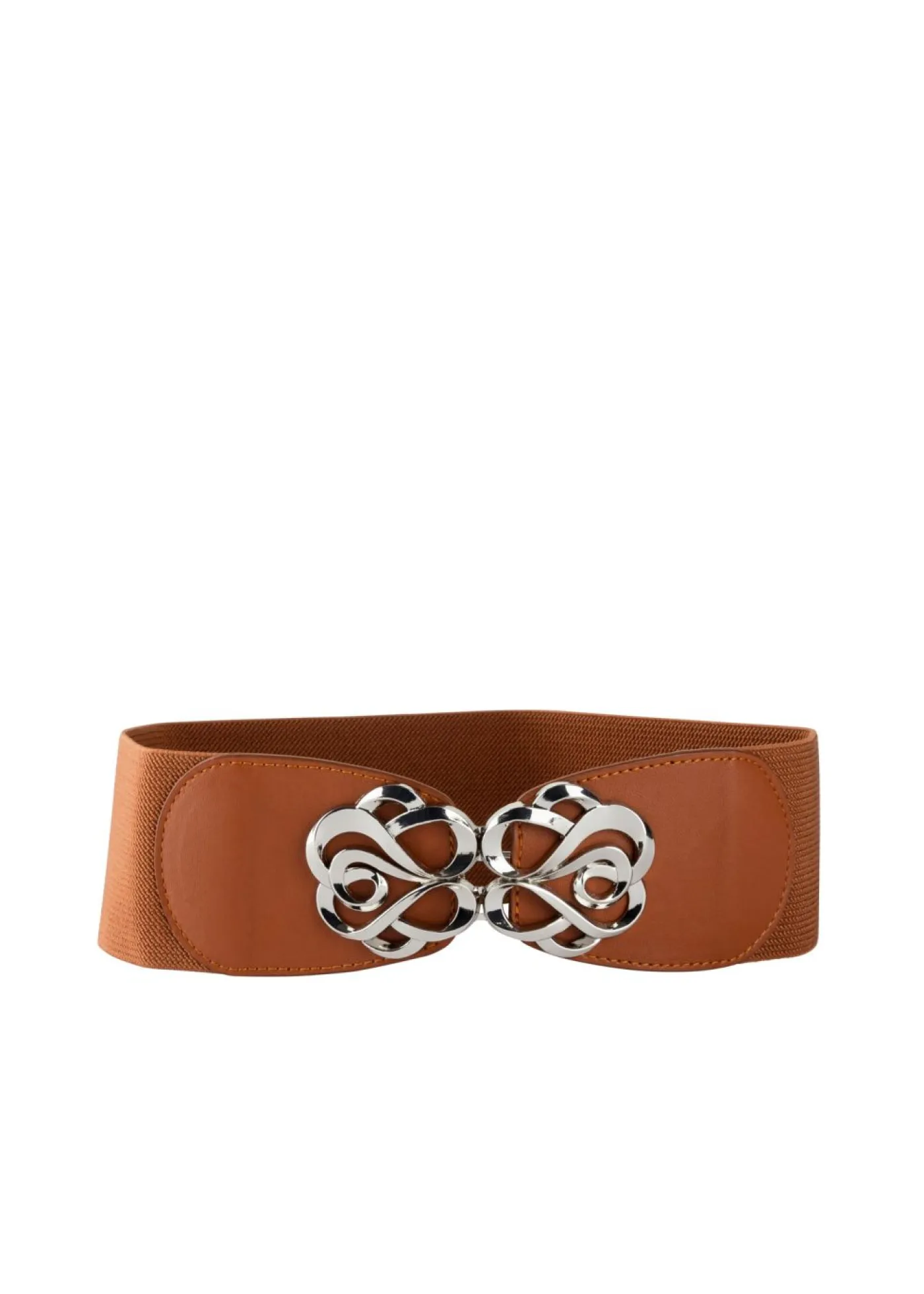 Moderno cinturón elástico con cierre decorativo. Cinturón elástico elegante con detalles plateados. Mejora cualquier atuendo. Ambos extremos del cinturón se unen con la ayuda de ganchos.