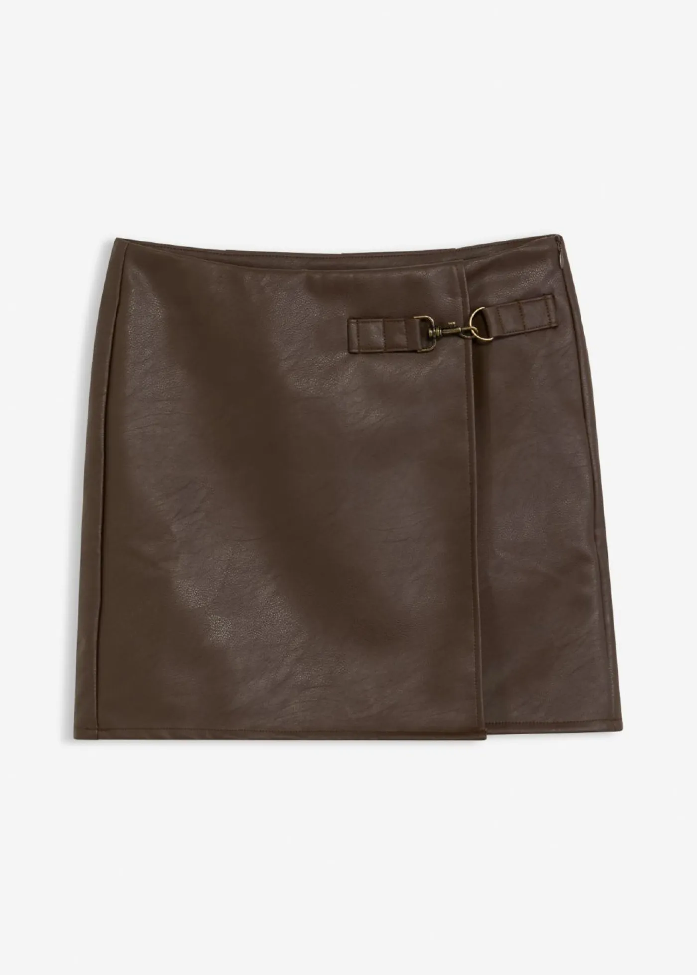 Falda corta de piel sintética con hebilla moderna en la parte delantera lateral.