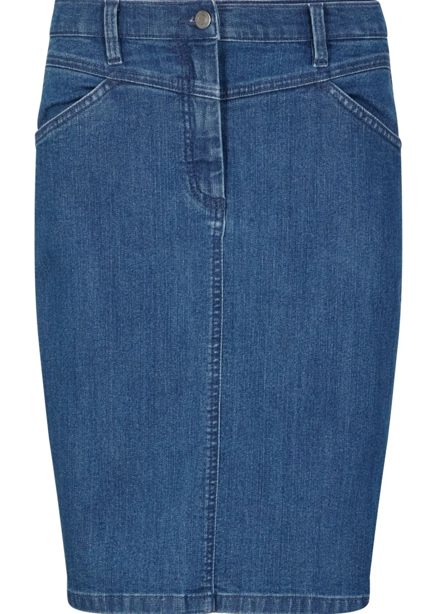 Falda vaquera de material elástico. No puedes equivocarte con esta clásica falda vaquera. El corte clásico, la forma recta y el color liso logran que la falda pueda combinarse fácilmente y que las mujeres con estilo gocen de una gran variedad de opciones de combinación. Tanto con una camiseta con estampado desenfadado para lograr una versión más deportiva como con una elegante blusa para el día a día de la oficina, esta falda vaquera combina con todas las ocasiones.