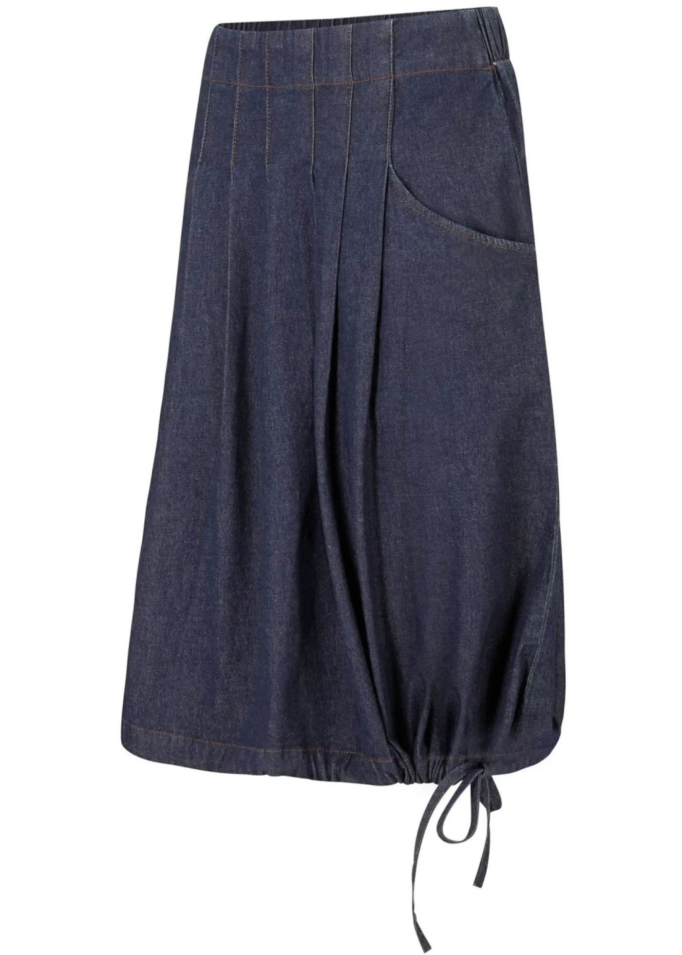 Elegante falda vaquera elástica con cintura elástica y cordón en el dobladillo.