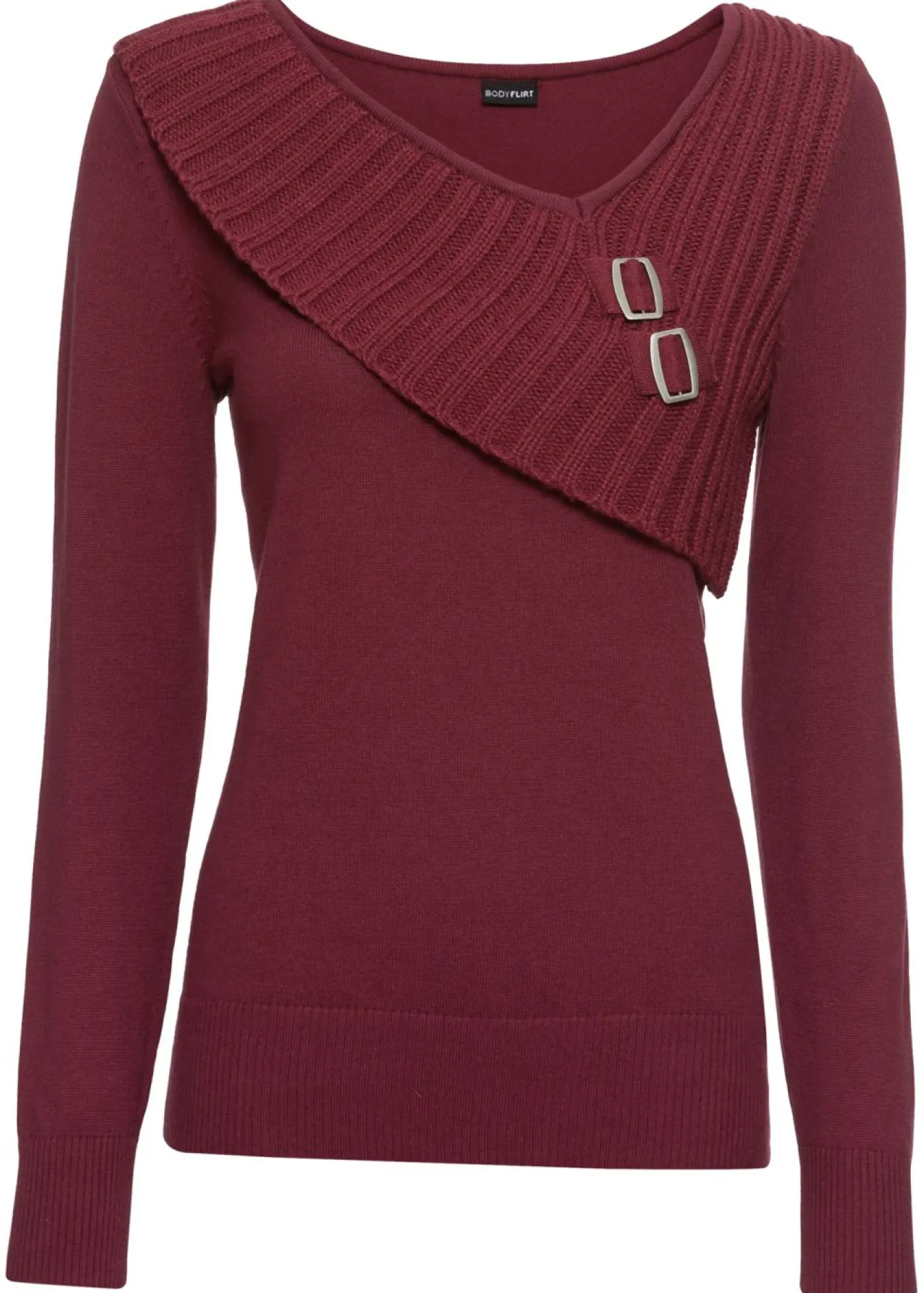 Bonito jersey con mezcla de tejidos y hebillas metálicas. Suéter de punto suave, con cuello de punto acanalado que incluye dos hebillas. Lavable a máquina. Largo aprox. 66 cm.