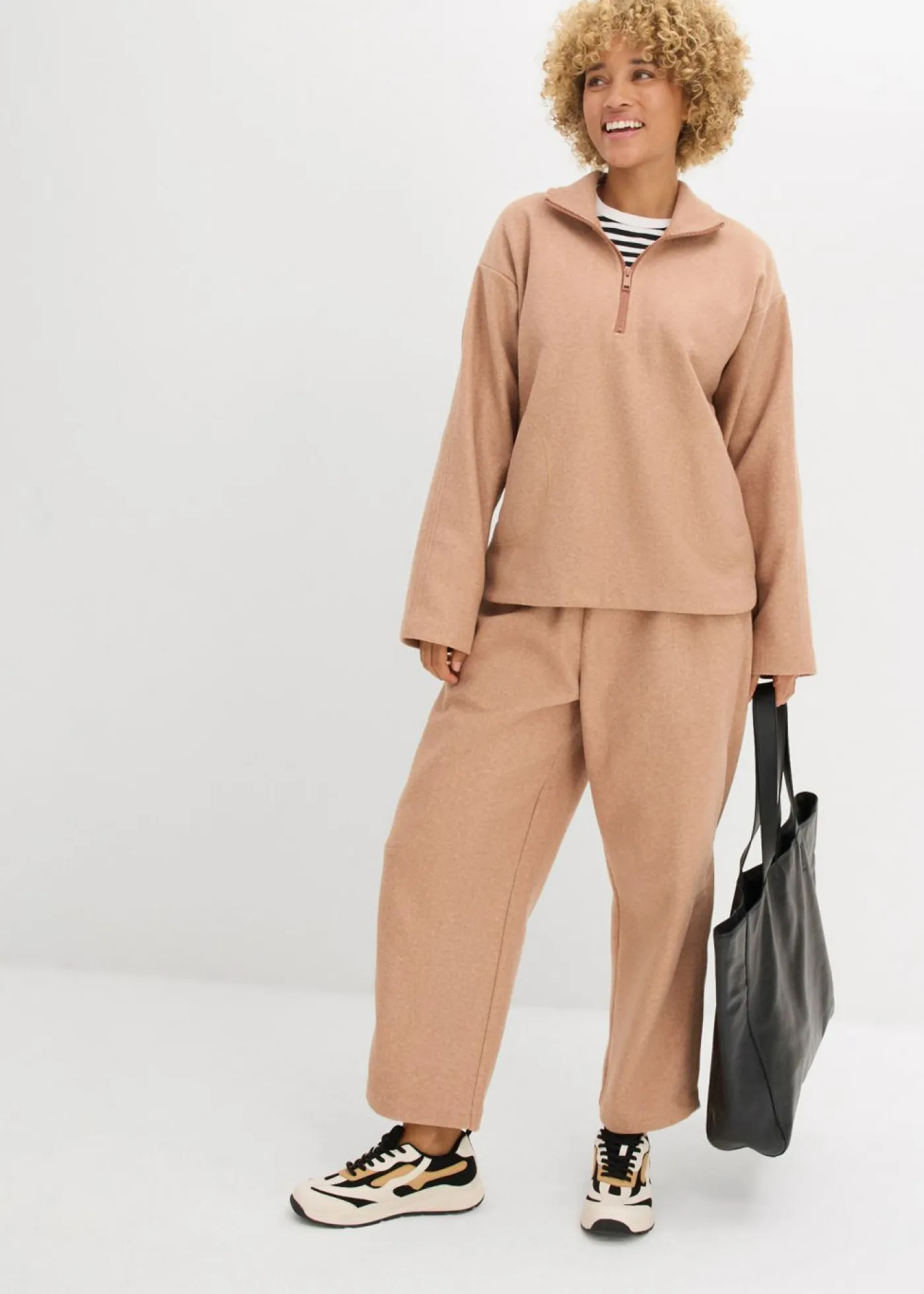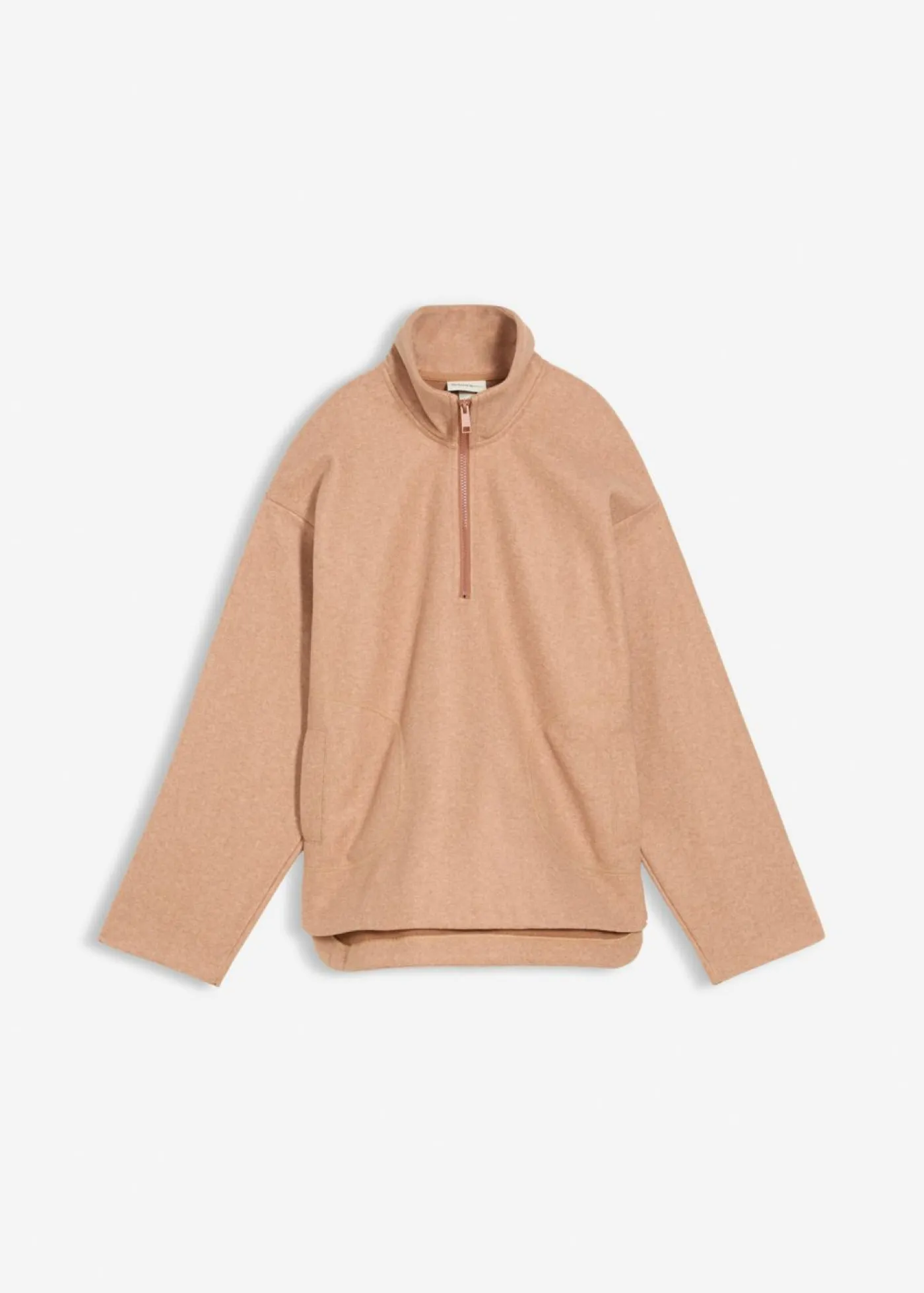Jersey holgado con cuello alto y cremallera corta. Hombros caídos y bolsillos laterales. Largo de aprox. 74 cm en talla 40/42. Se puede lavar a máquina.