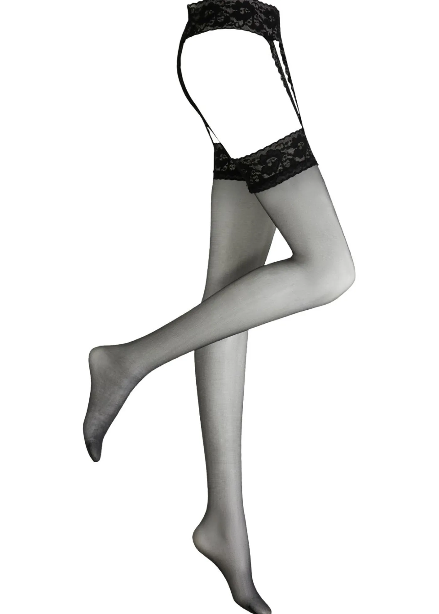 Medias de seda brillante con tirantes de encaje. Media y liguero todo en uno. Con gran brillo de seda, con banda de ribete, tirantes y liguero de auténtico encaje. Especialmente elástico y extensible, con tope de malla en la puntera, totalmente entallado.