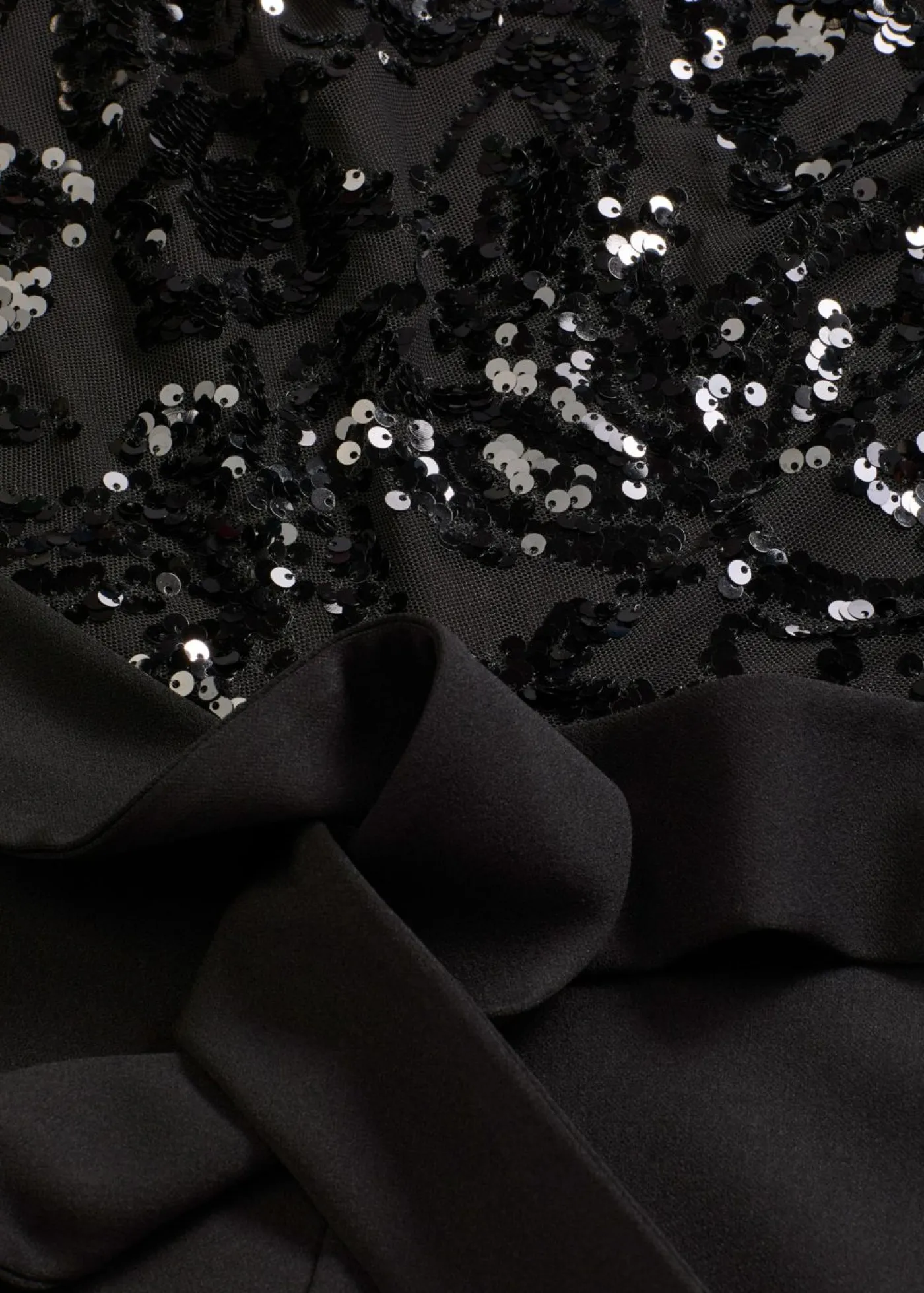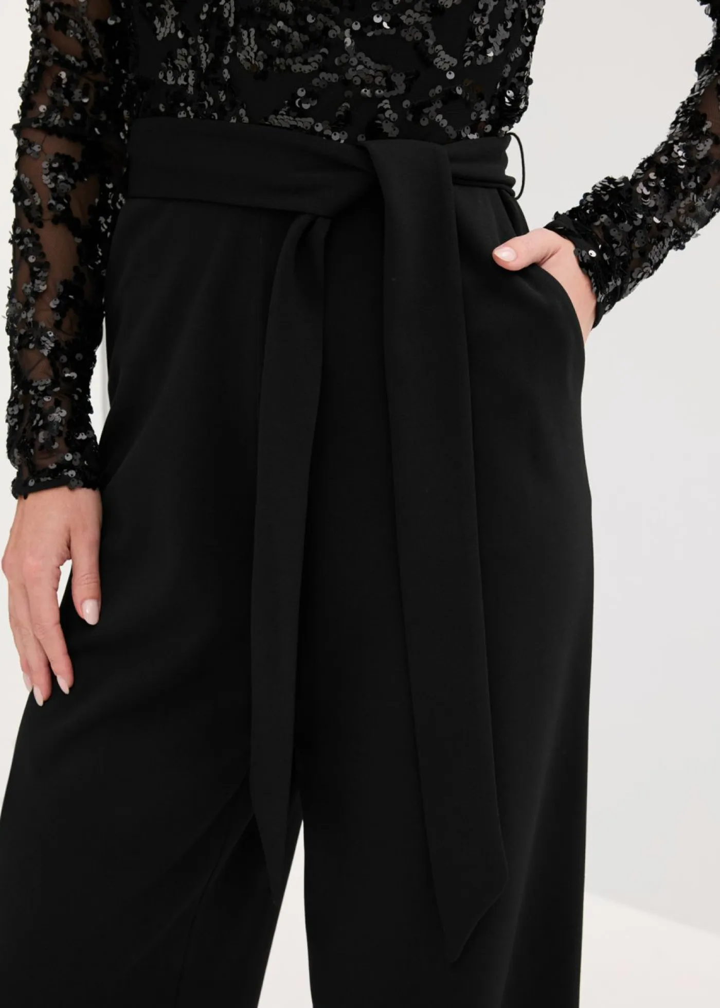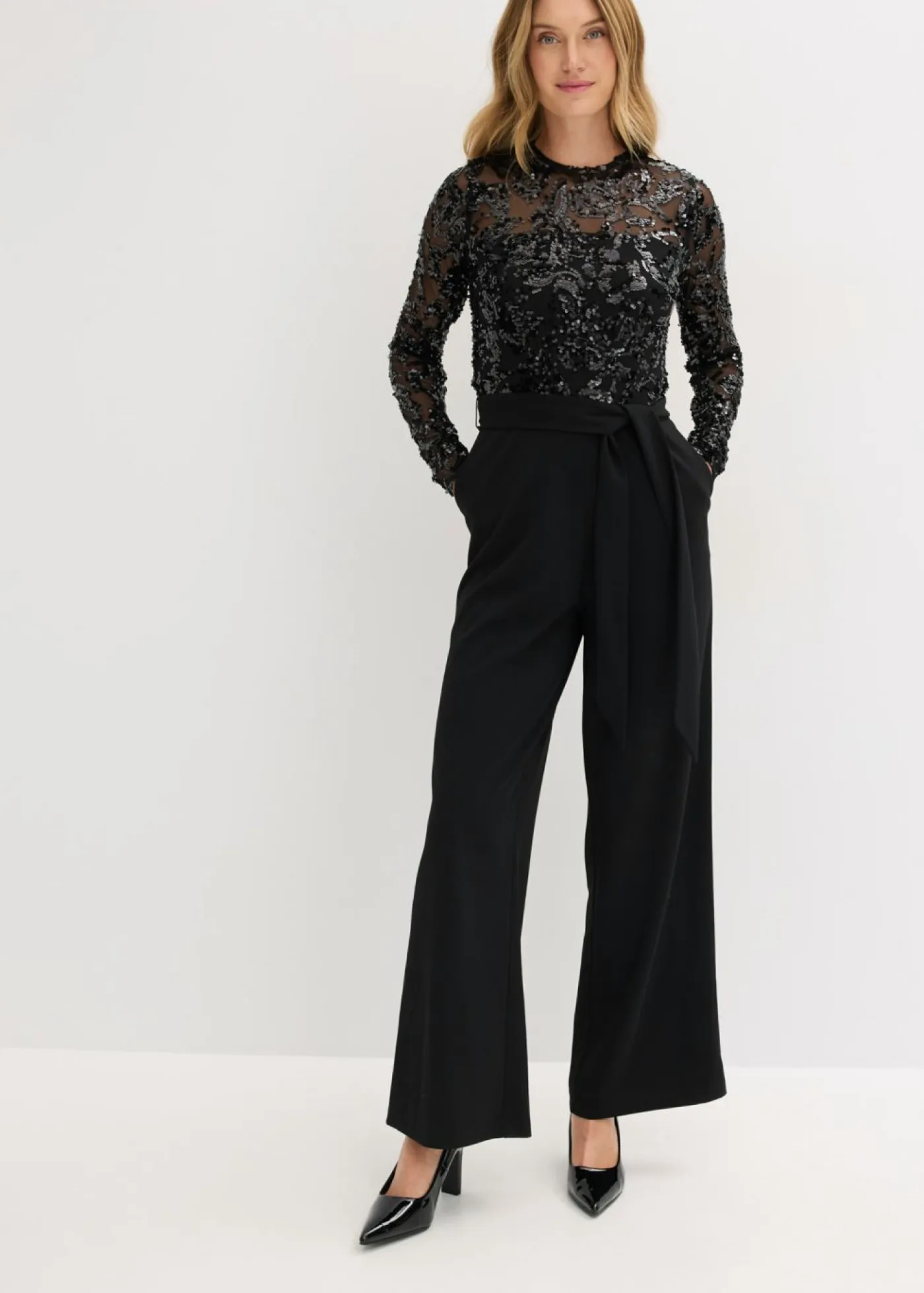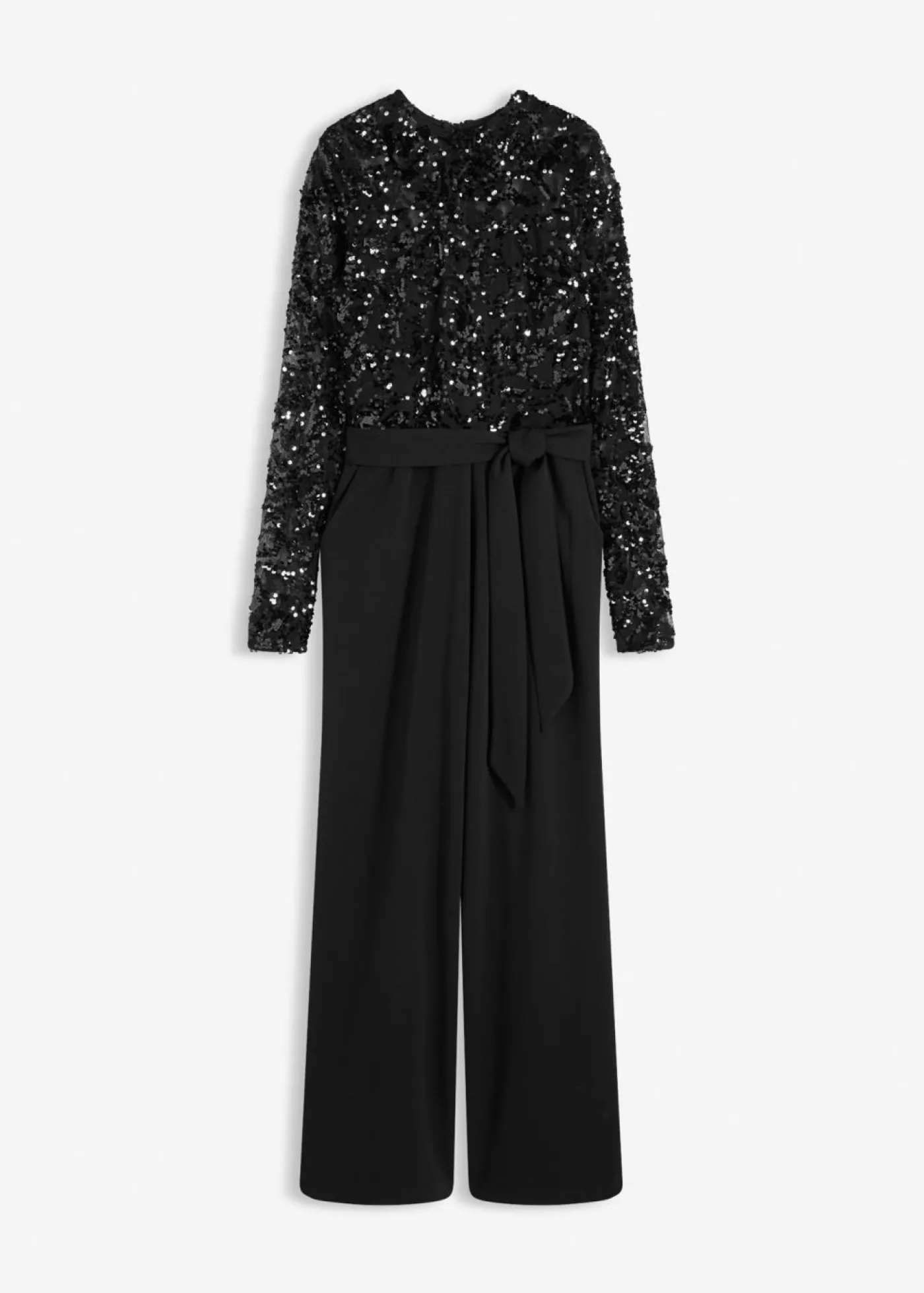 Moderno y femenino: mono con bordado de lentejuelas y detalle de lazo en la cintura.