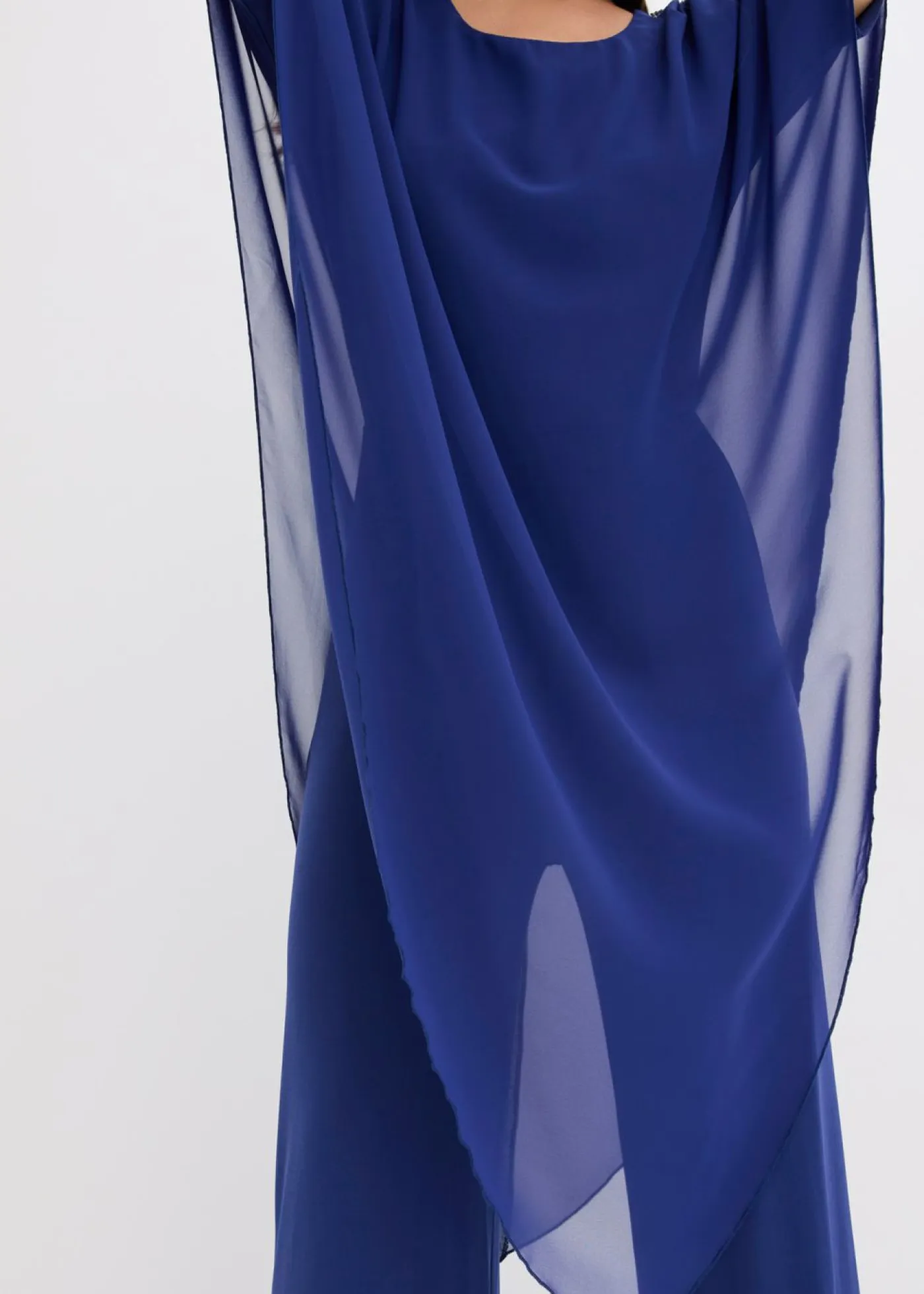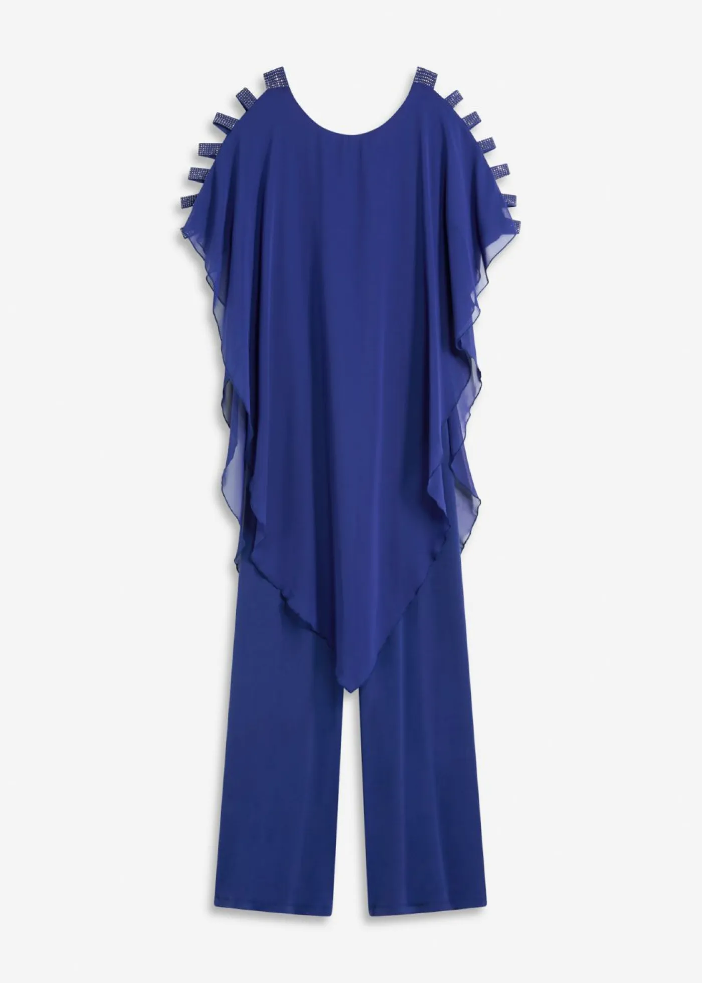 Moderno y femenino: Mono con fina gasa superpuesta y apliques de pedrería en las mangas con aberturas.