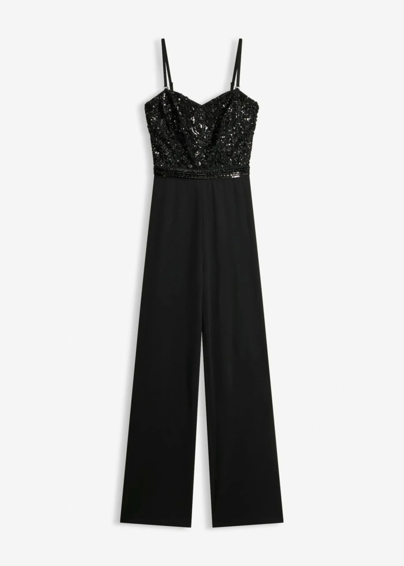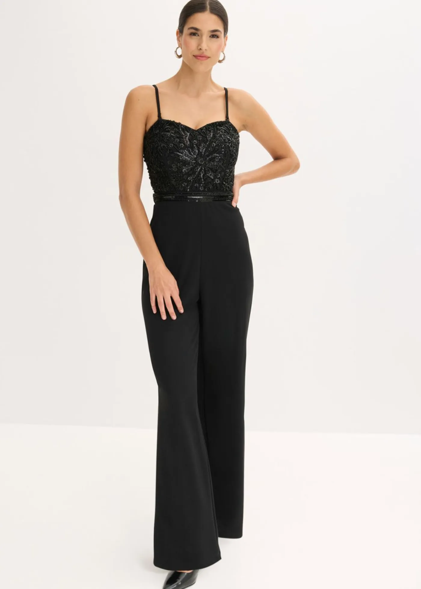 Moderno y sensual: Mono de crepé estructurado con escote tipo bustier y bordado de perlas en la parte superior.