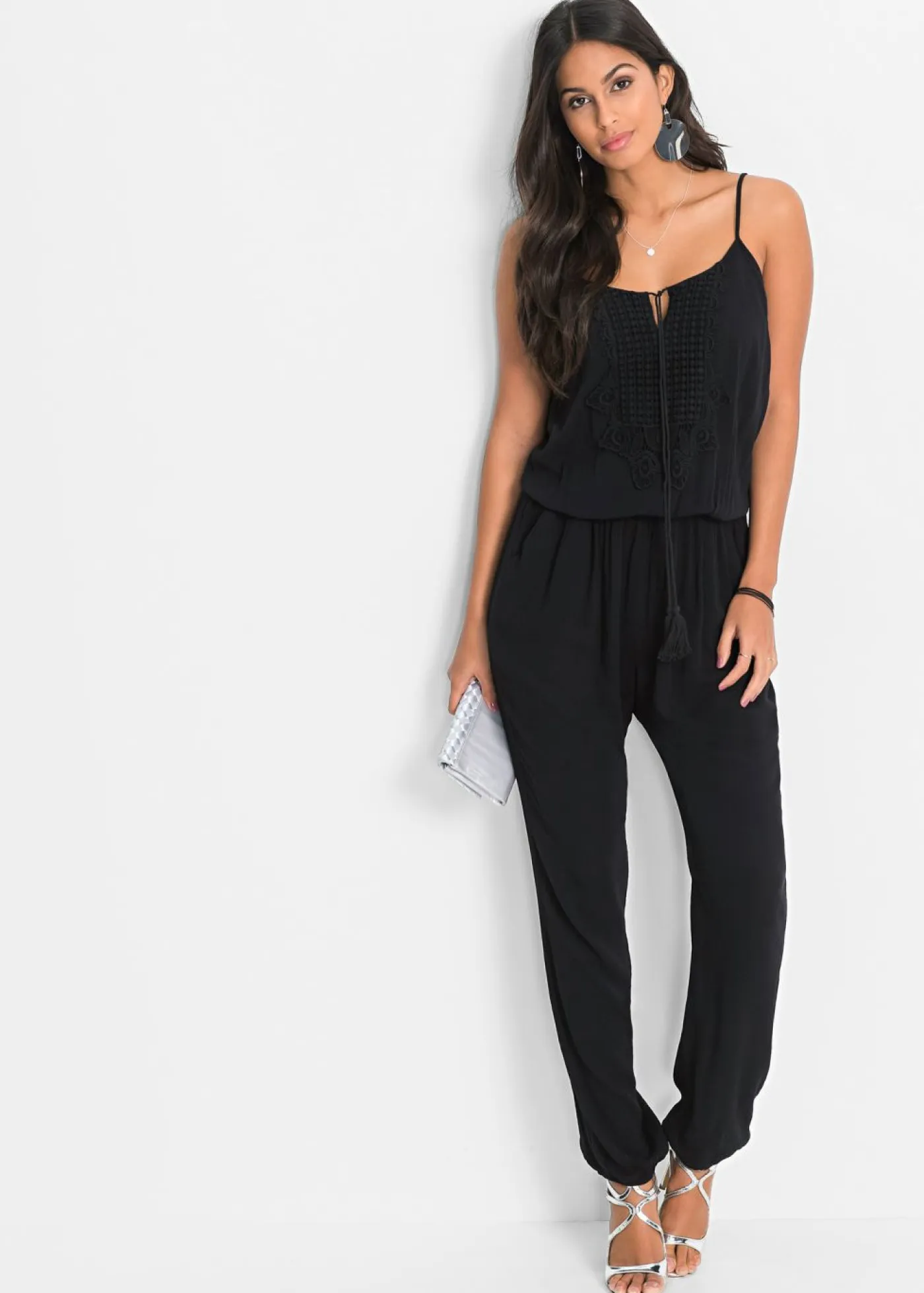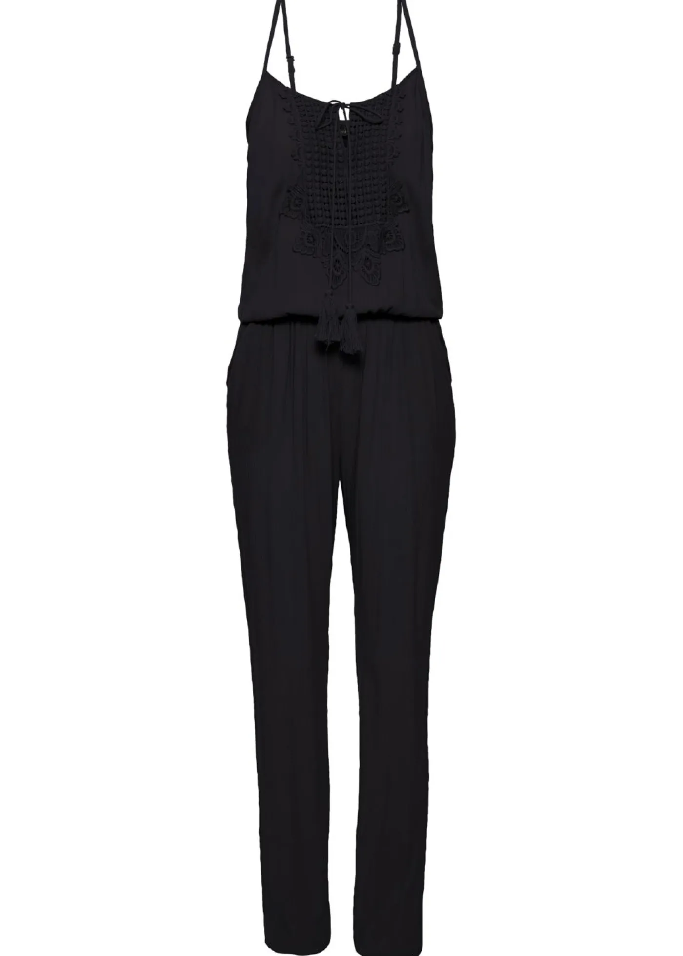 Mono sin mangas con encaje y detalle de cordón. Mono vaporoso con encaje en el escote y cordones para anudar. Tirantes ajustables, banda elástica en cintura, bajos y espalda, así como bolsillos traseros laterales. Tejido suave en 100 % viscosa con aspecto de crepé. Largo interior de la pierna de 80 cm en la talla 36.