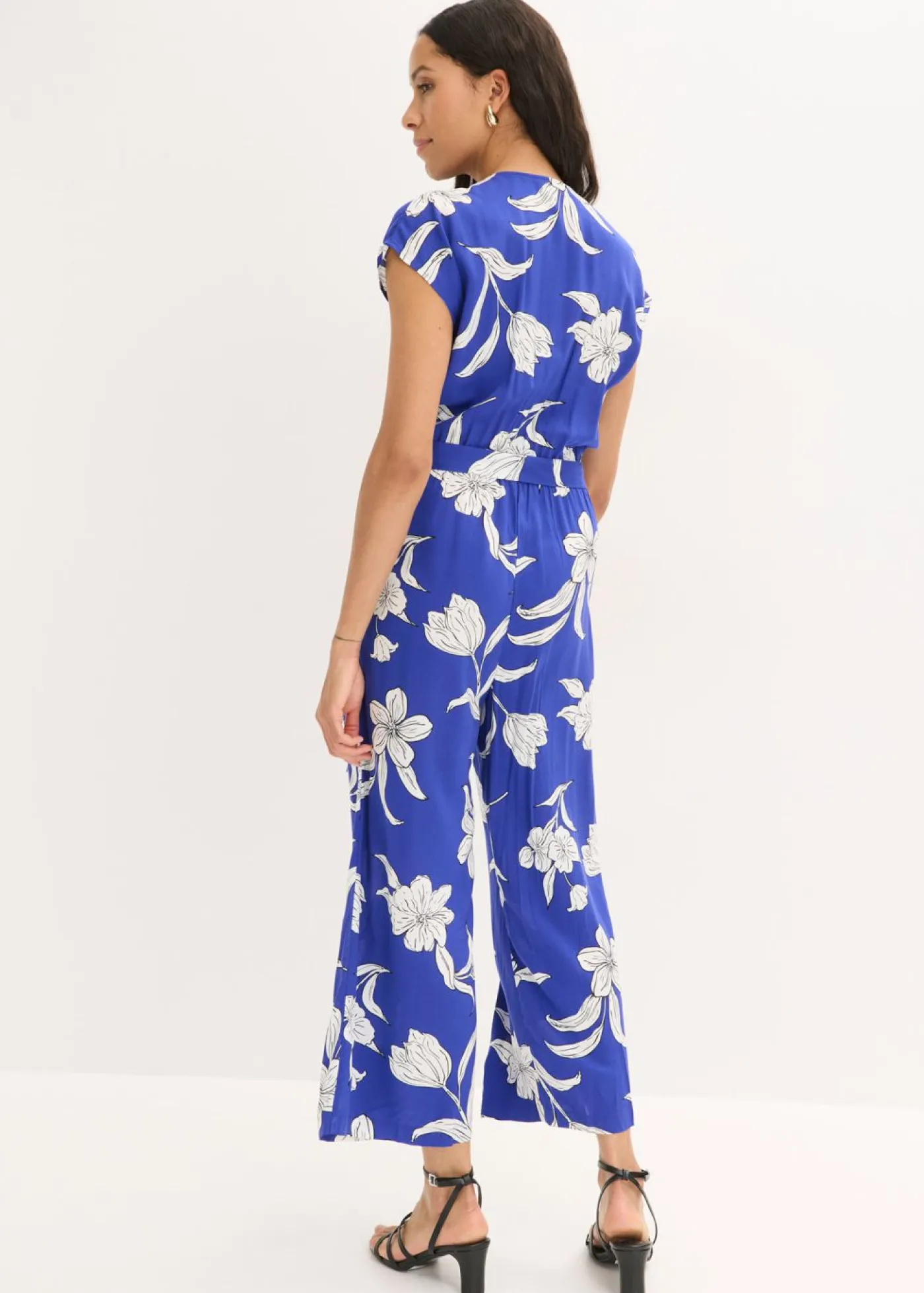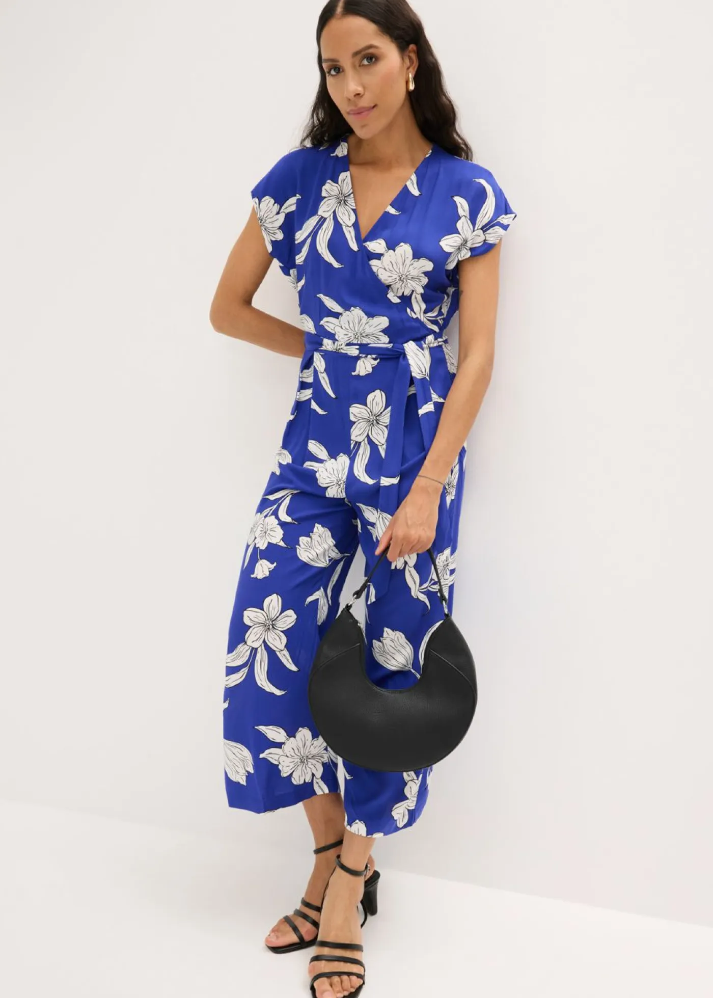 Mono con estampado de flores, escote en V superpuesto en la parte delantera y cintura elástica en la parte trasera.