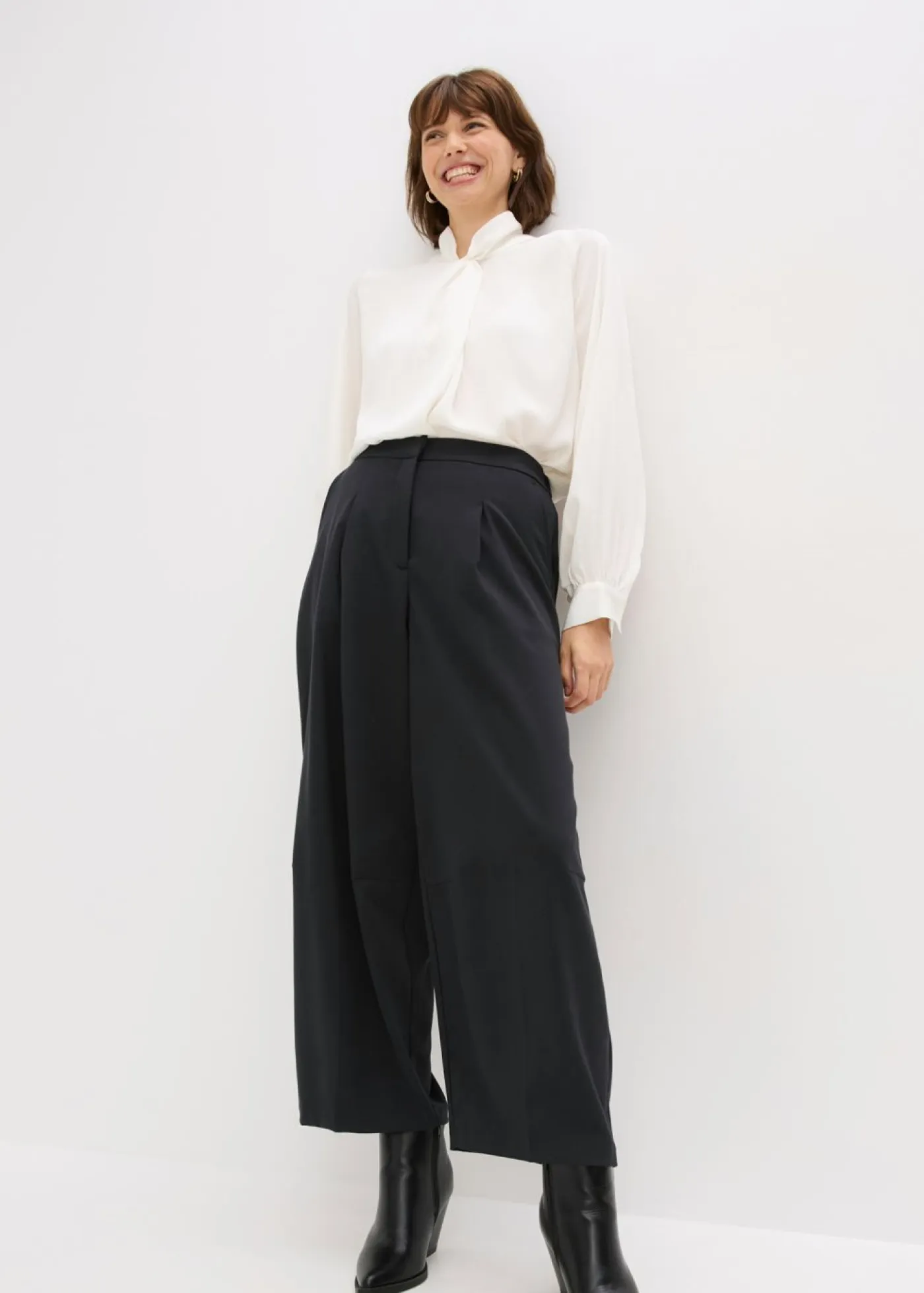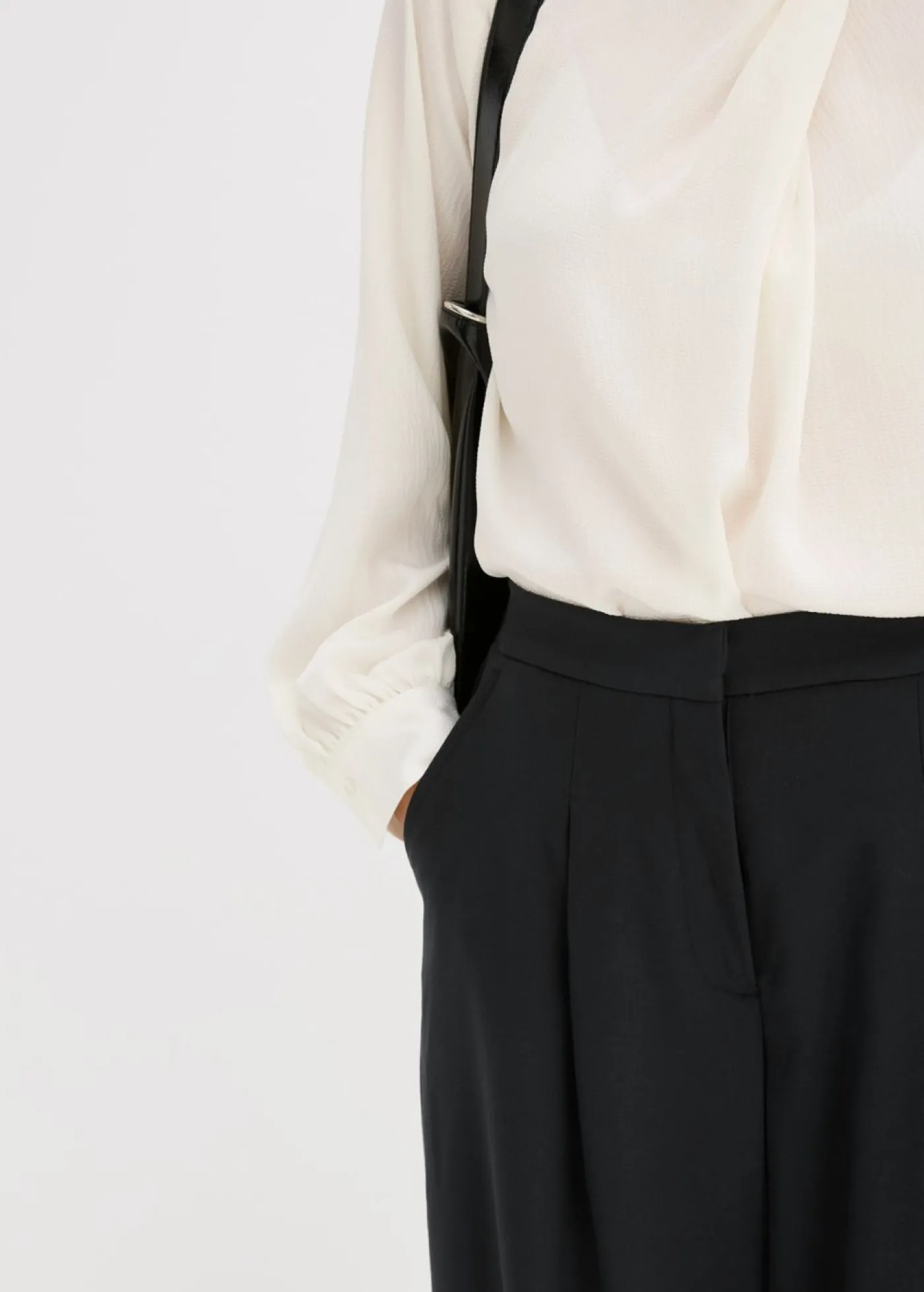 Pantalón con pinzas, corte ligeramente barrel, bolsillos laterales y cintura parcialmente elástica con cremallera y cierre de gancho oculto en la parte delantera.