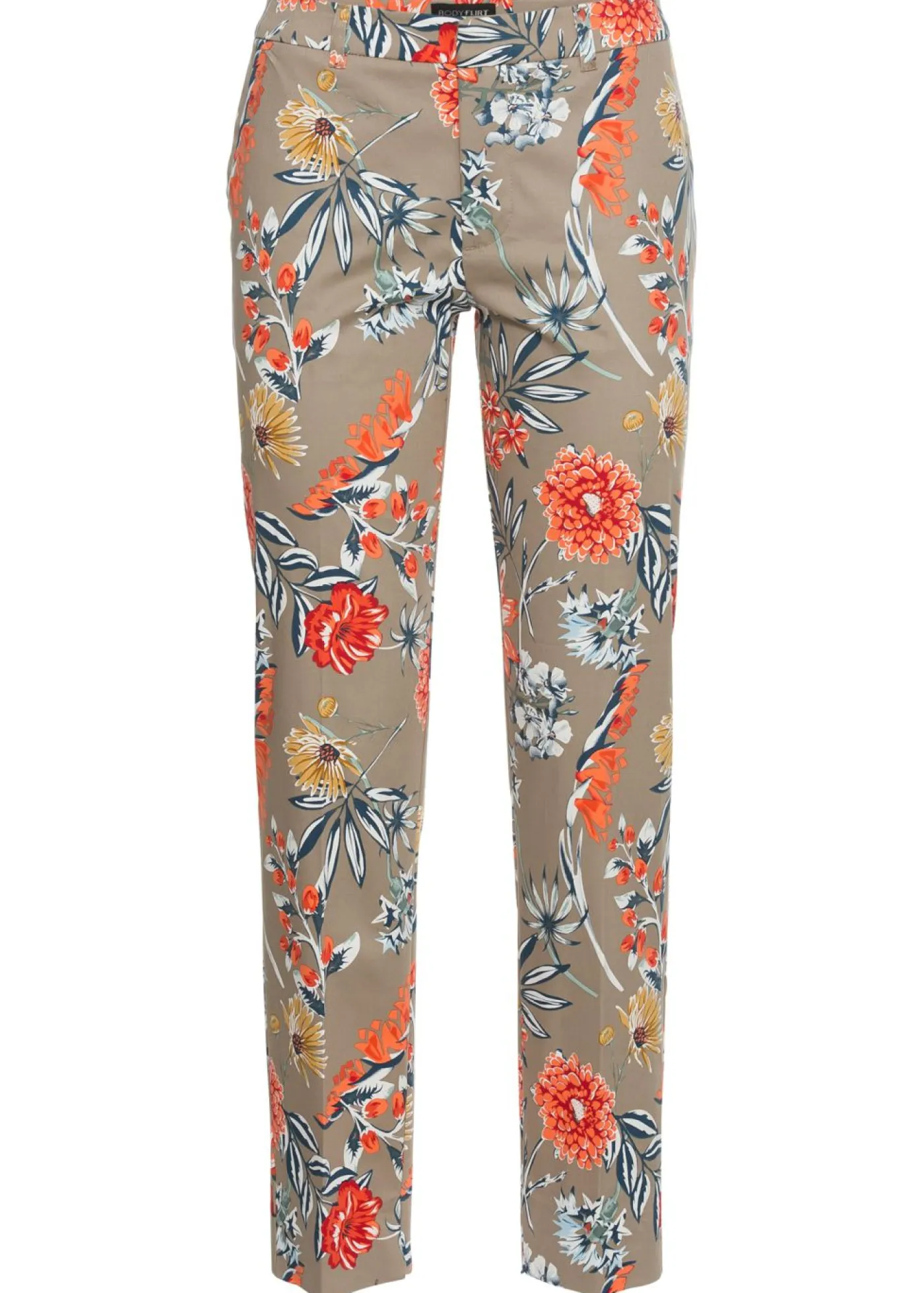 Cómodo pantalón elástico capri con diseño de flores. El elegante pantalón elástico capri con dos bolsillos laterales y el sutil pliegue en la parte delantera y trasera otorgan un estilo clásico al pantalón elástico. También cuenta con una pequeña ranura en el extremo del dobladillo. ¡Un punto de atracción en cualquier ocasión! Largo interior de la pierna de aprox. 71,5 cm en talla 38.