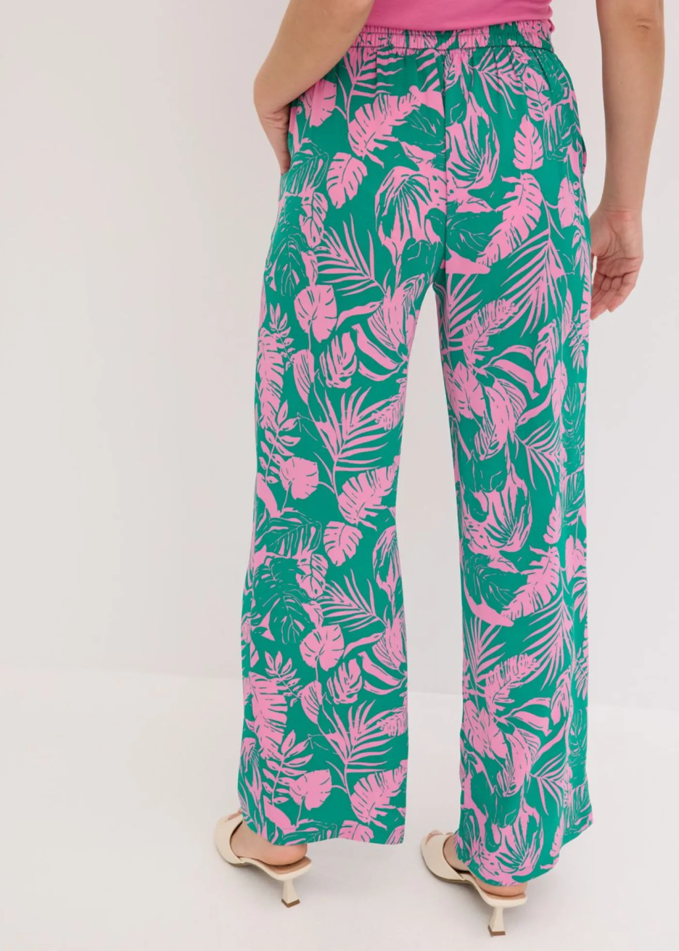 Moderno pantalón ancho de satén estructurado con goma elástica en la parte trasera y estampado de flores.