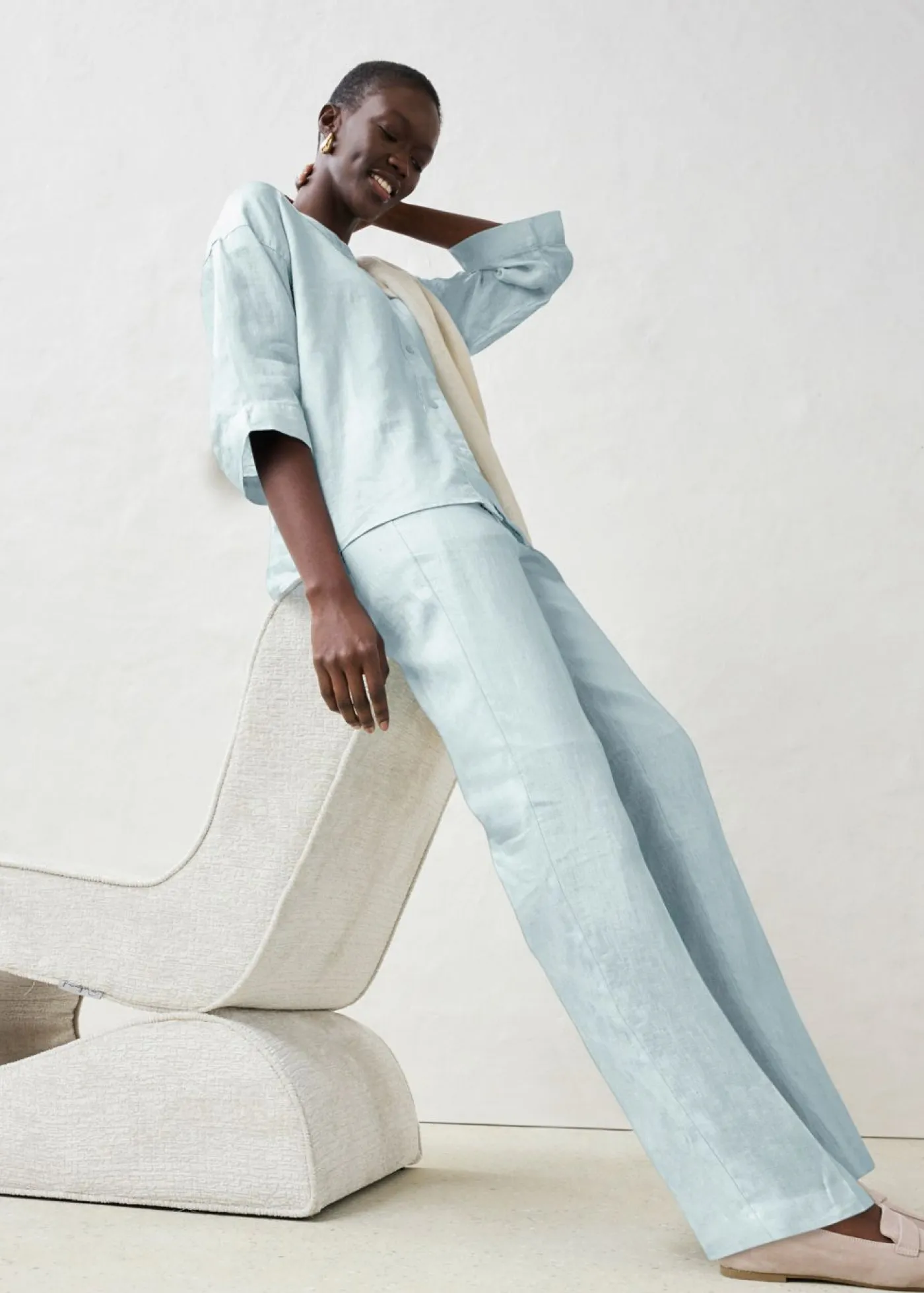 Pantalón ancho de lino puro de alta calidad. El lino es una fibra natural resistente y, gracias a sus propiedades fibrosas, transpira la piel. Se caracteriza por los finos pliegues y la superficie estructurada. Agradable y vaporoso, el lino será tu compañero ideal para el verano.