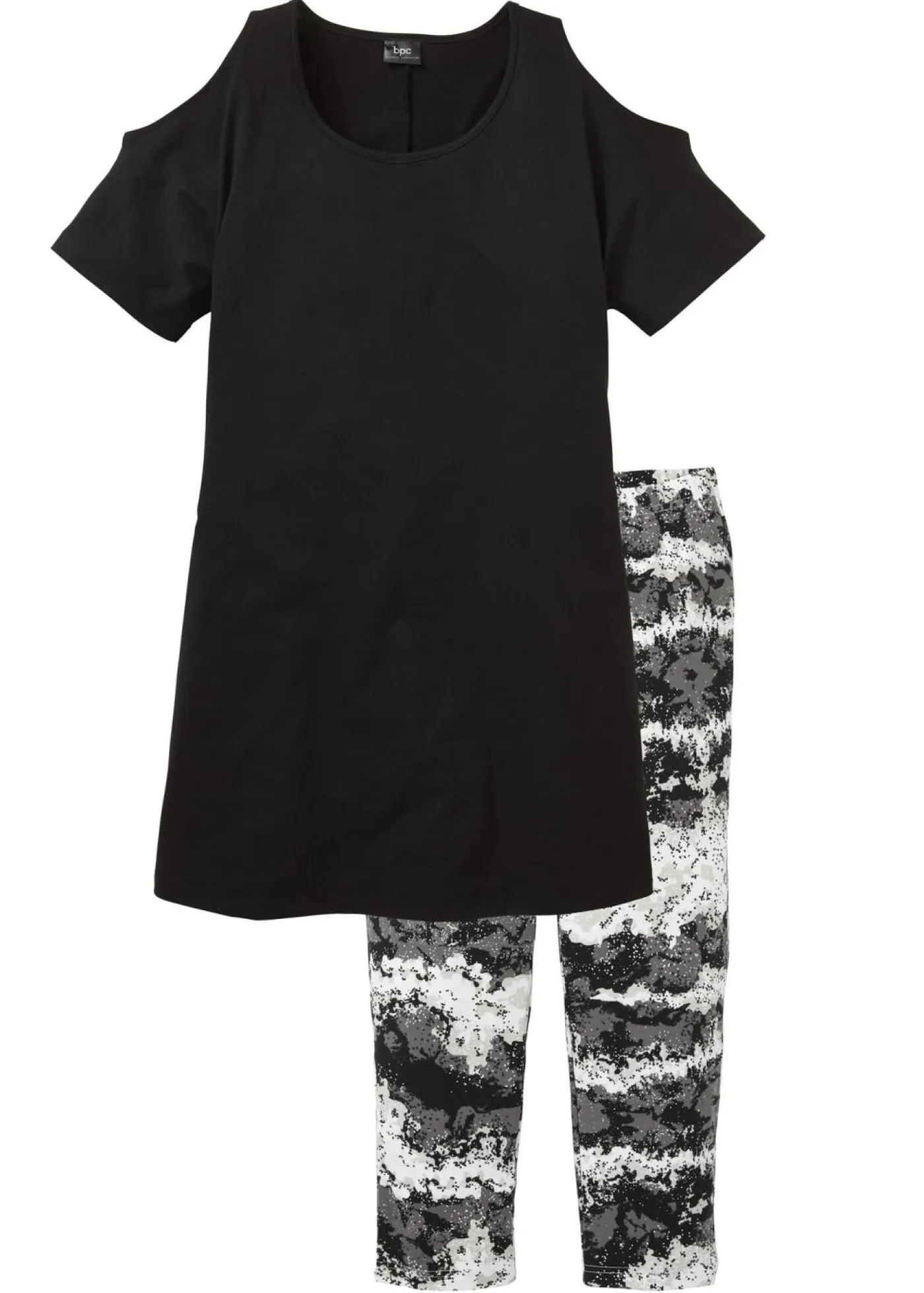 Pijama cut out. Cómodo pijama capri con un diseño poco habitual. El top de manga corta está diseñado con un generoso escote redondo y grandes aberturas en los hombros. El pijama se completa con un pantalón capri 3/4 elástico con una cómoda cintura elástica.