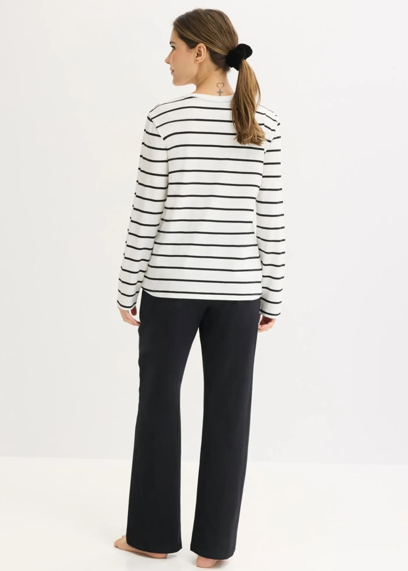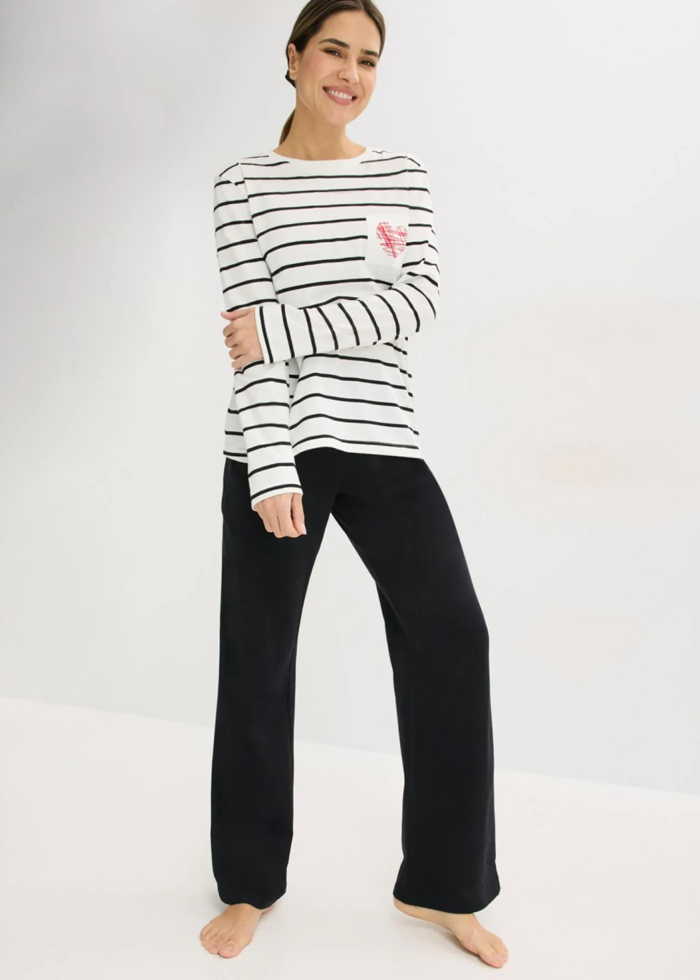 Pijama cómodo compuesto por una camiseta con mangas largas y estampado de corazones en el bolsillo en el pecho y un pantalón largo con perneras anchas y bolsillos.
