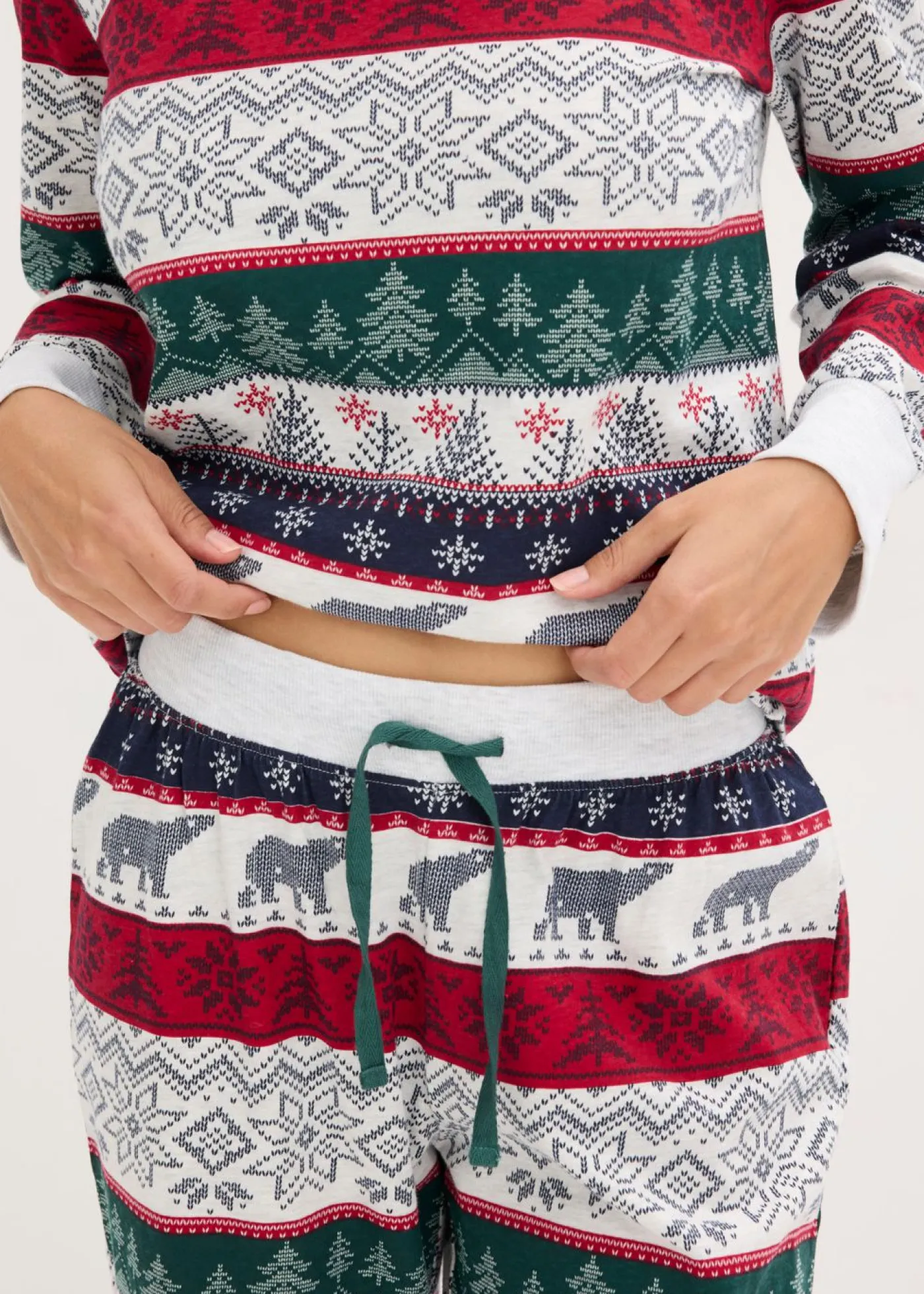 Cómodo pijama con patrón nórdico: camiseta de manga larga con cuello alto y pantalón holgado con bolsillos.