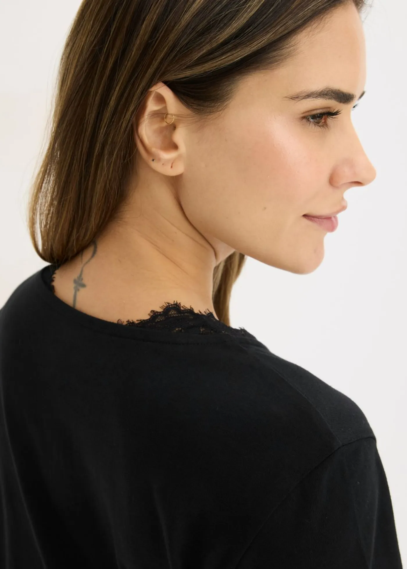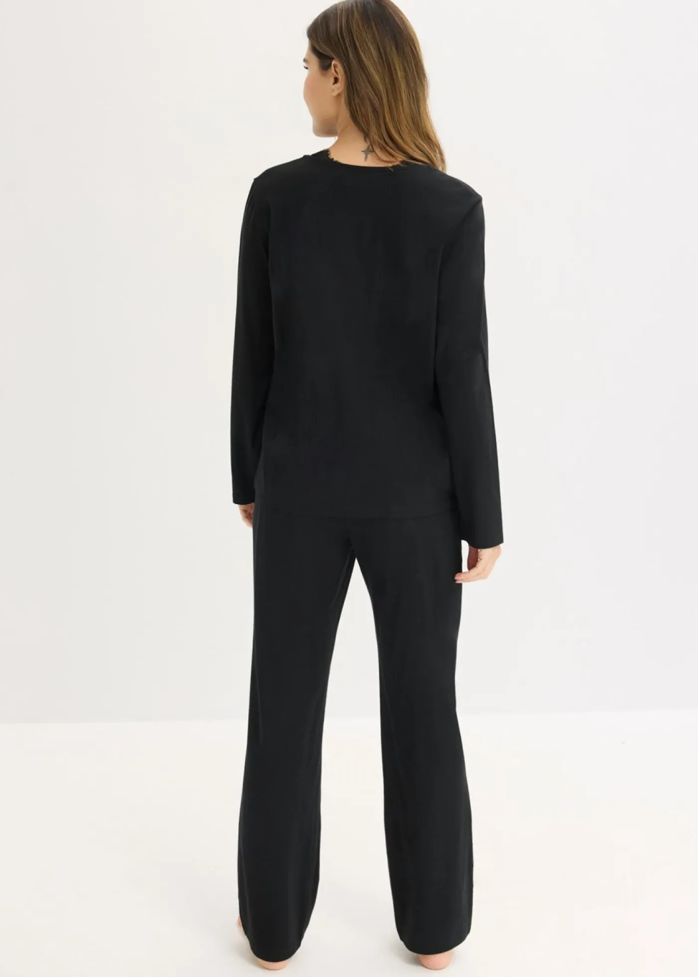Pijama cómodo con ribete de encaje en el cuello, botones y bolsillos laterales en el pantalón.