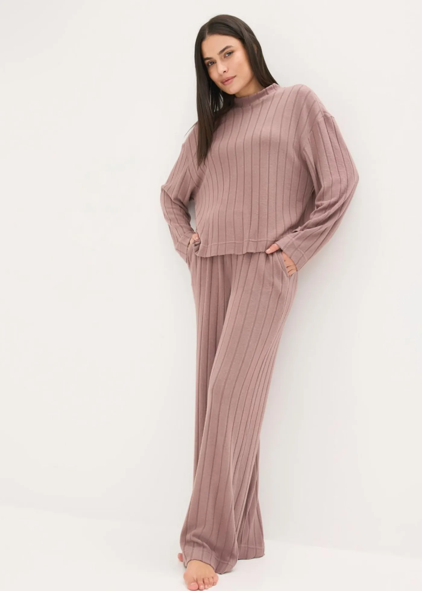 Moderno pijama holgado con cuello alto, mangas anchas, pantalón ancho y bolsillos laterales.