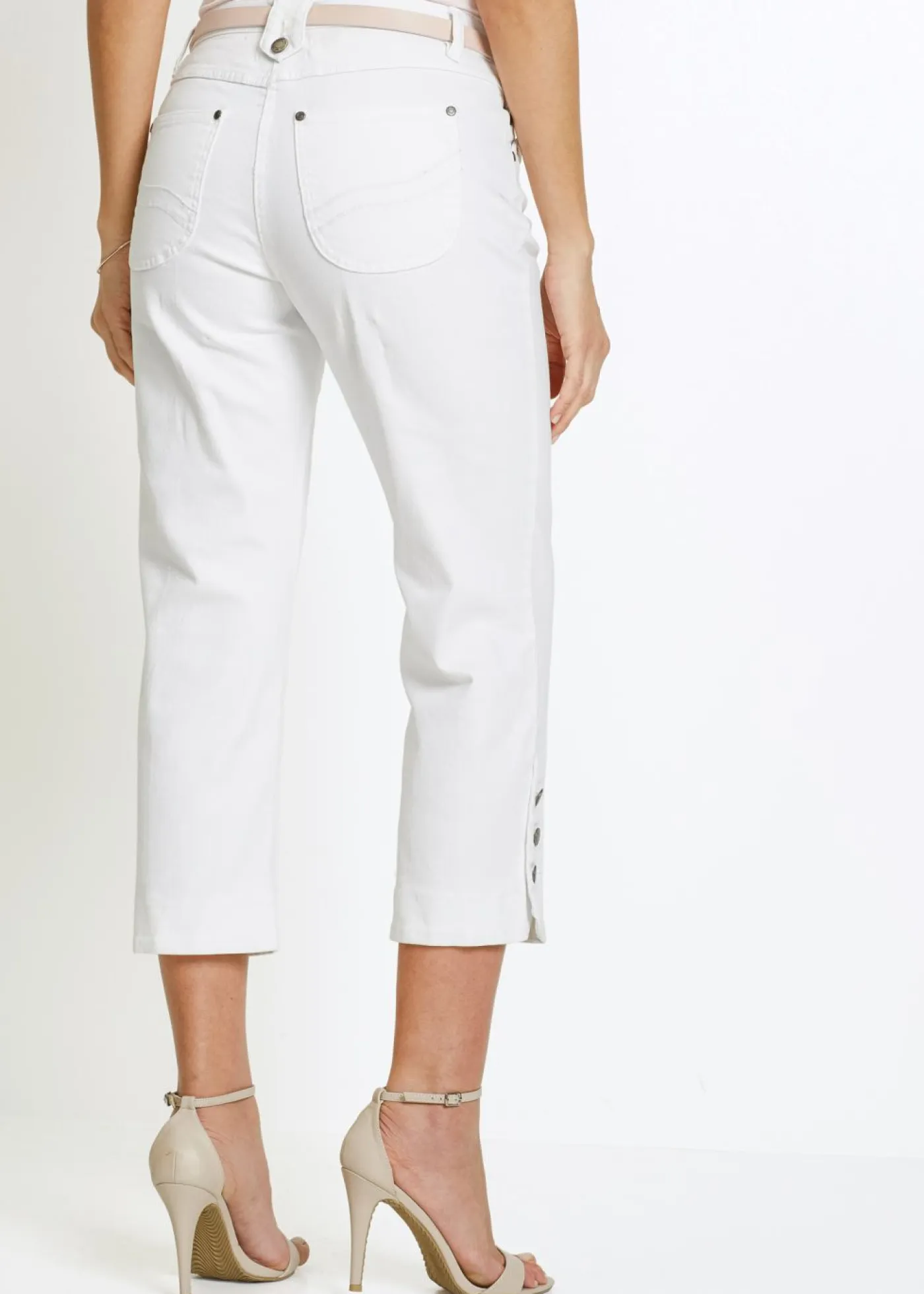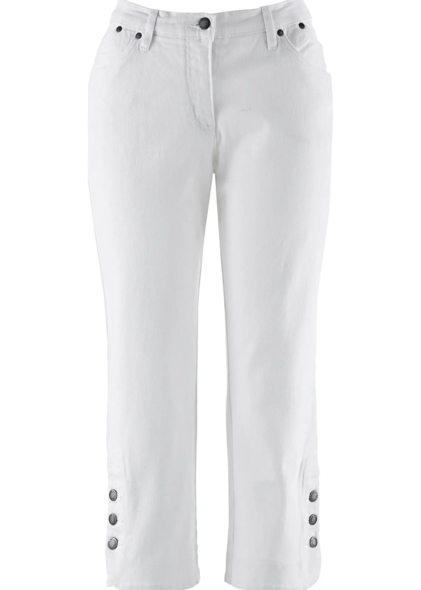 Vaqueros con estilo y corte capri. Pantalón vaquero de corte pirata y tiro regular con cuatro bolsillos delanteros y dos traseros. Aberturas en los bajos con decoración de botón. Lavable a máquina.
