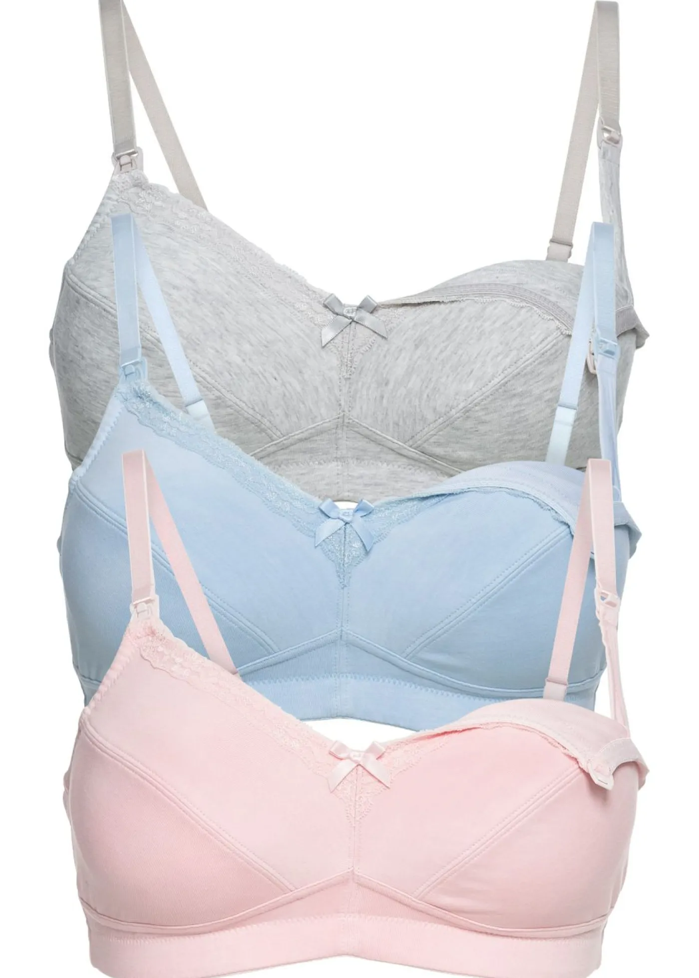 Cómodo sujetador de lactancia con atractivo ribete de encaje. Aquí encontrarás tres bonitos sujetadores de lactancia sin aros. Cómodos de llevar gracias a la suavidad del algodón. La copa forrada de algodón garantiza un ajuste cómodo. Una estrecha banda de encaje en la parte superior de la copa adorna este sujetador de lactancia. Con cierres de clip para facilitar la apertura de las copas con una sola mano. 1 blanco, 1 negro y 1 gris jaspeado.