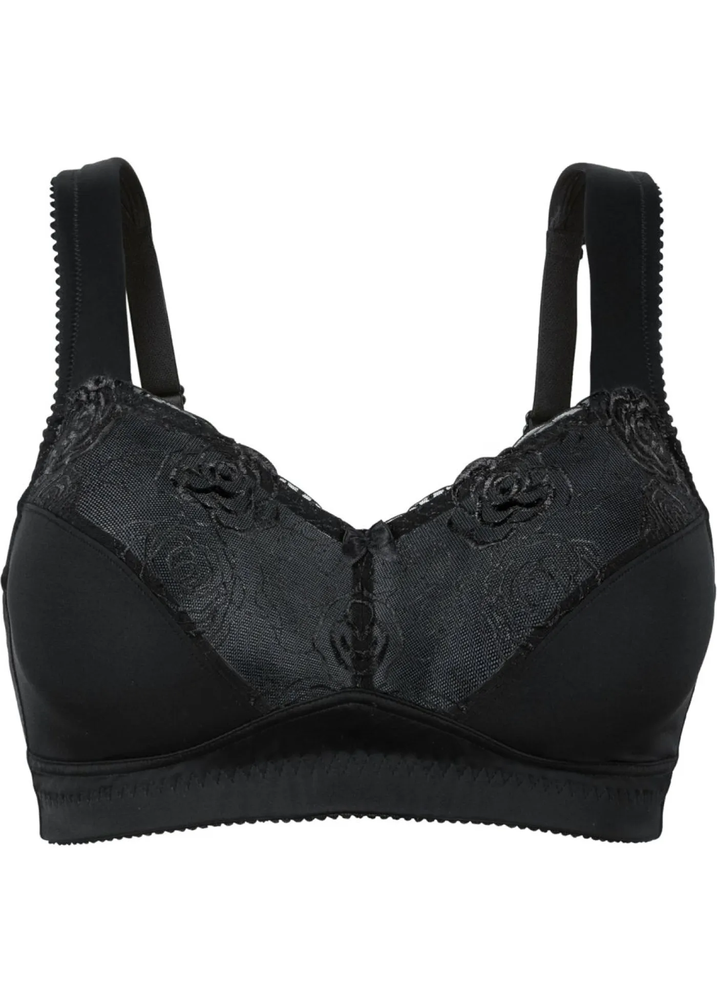 Cómodo sujetador con bordado de diseño floral. El corte especial sin aros con tirantes acolchados logra que el pecho parezca más pequeño.