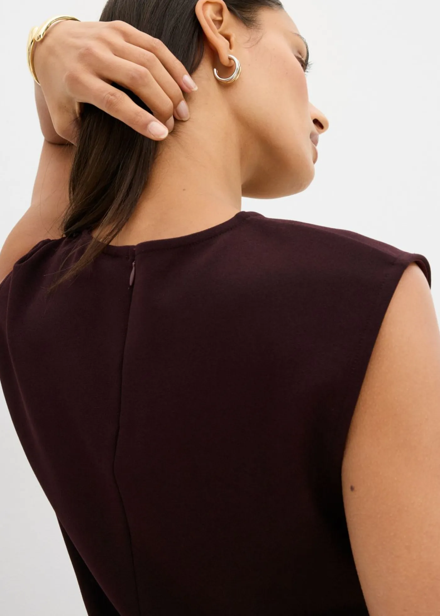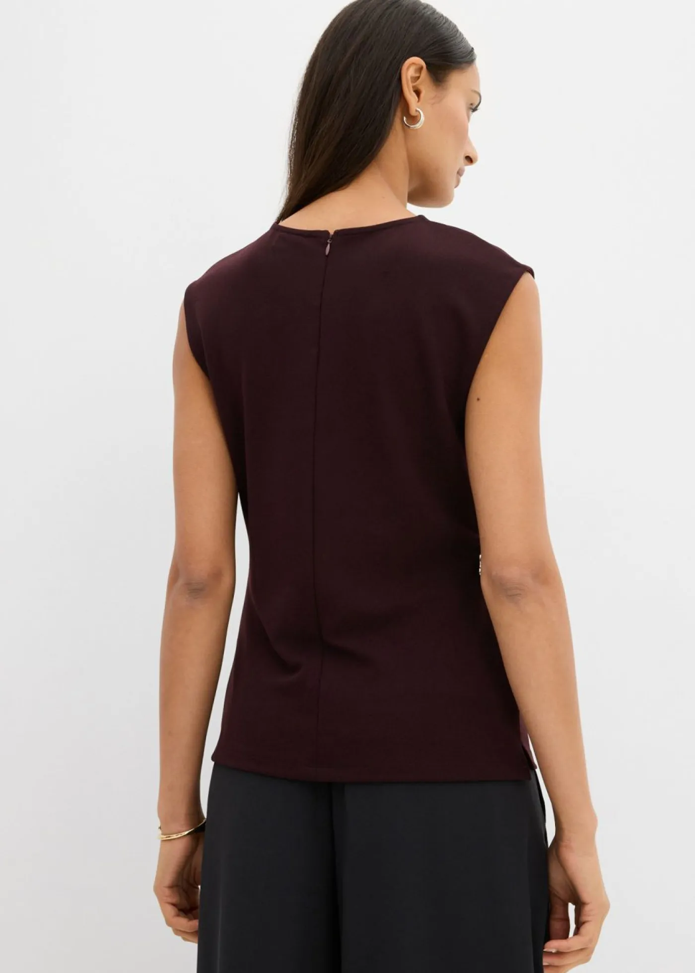 Top sin mangas con cintura fruncida y hebilla decorativa en la cintura. Cremallera oculta en la parte posterior.