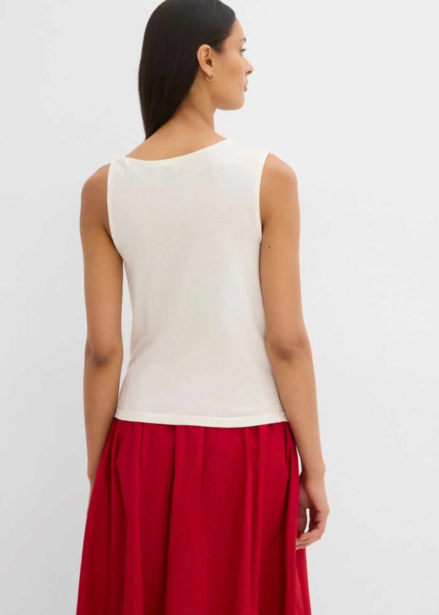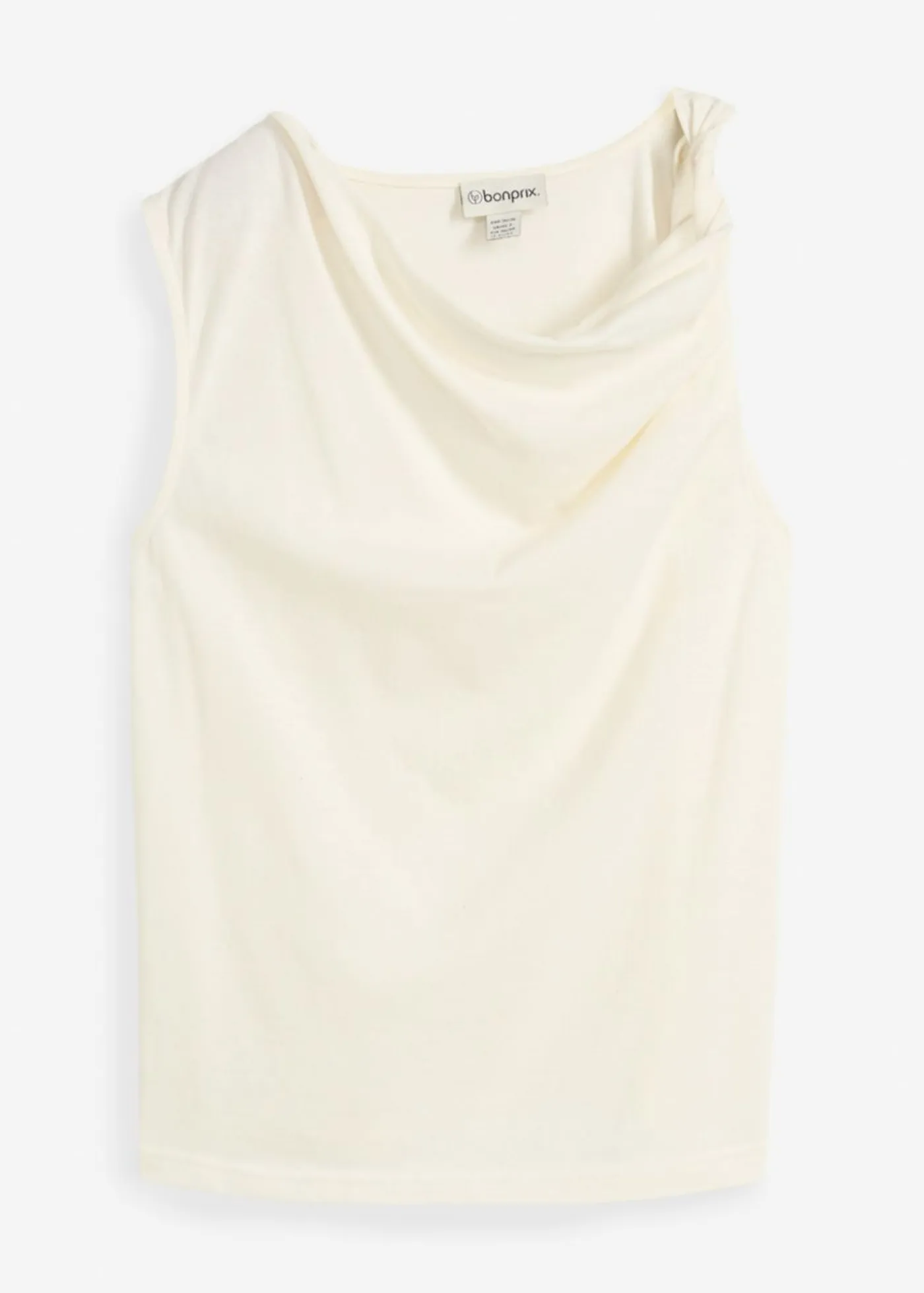 Top de punto ligero con escote en cascada y diseño sin mangas.