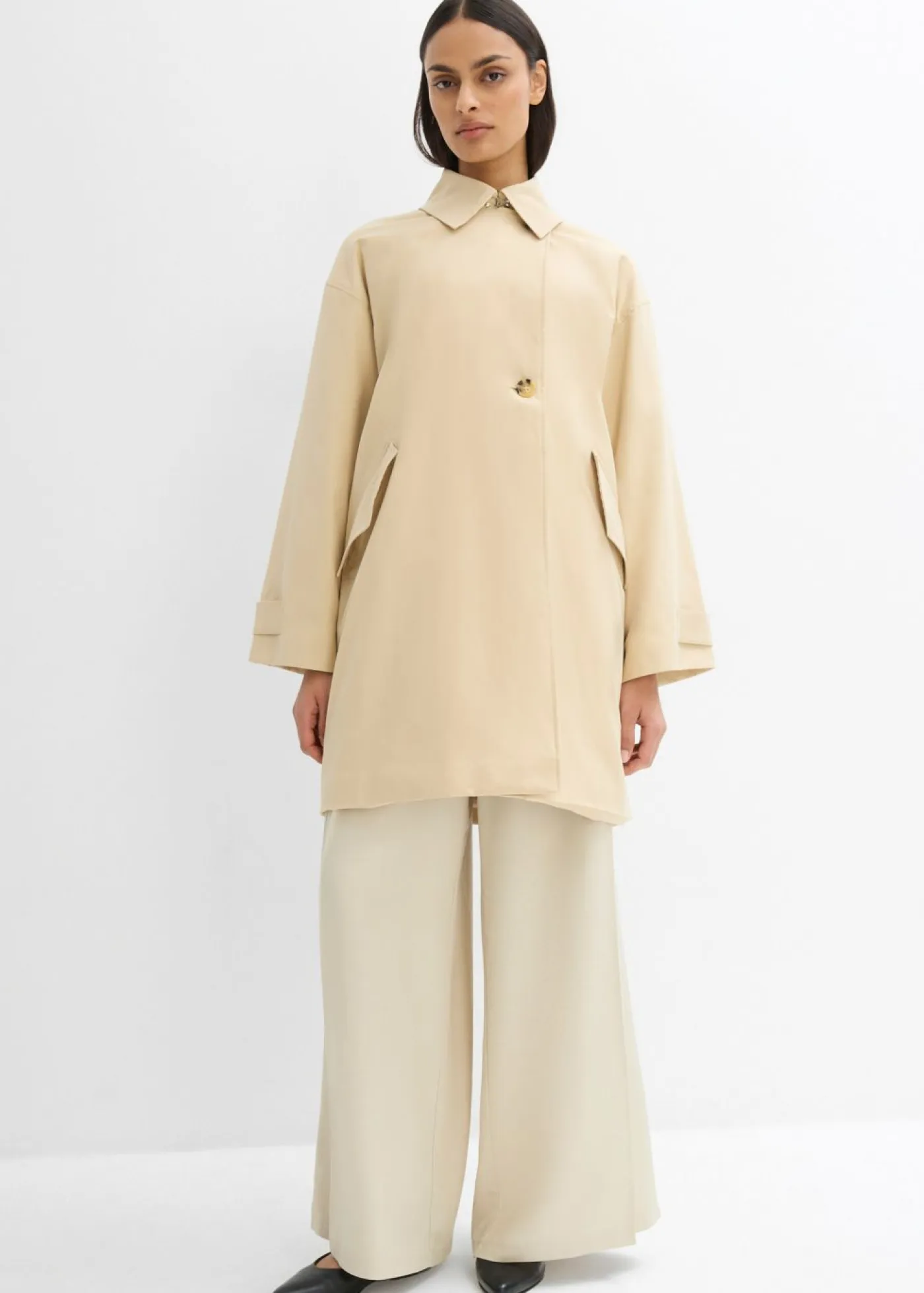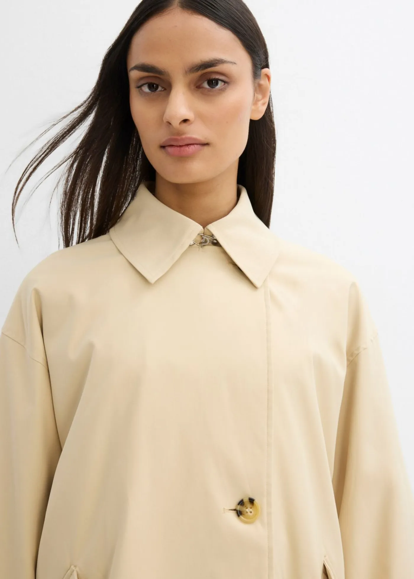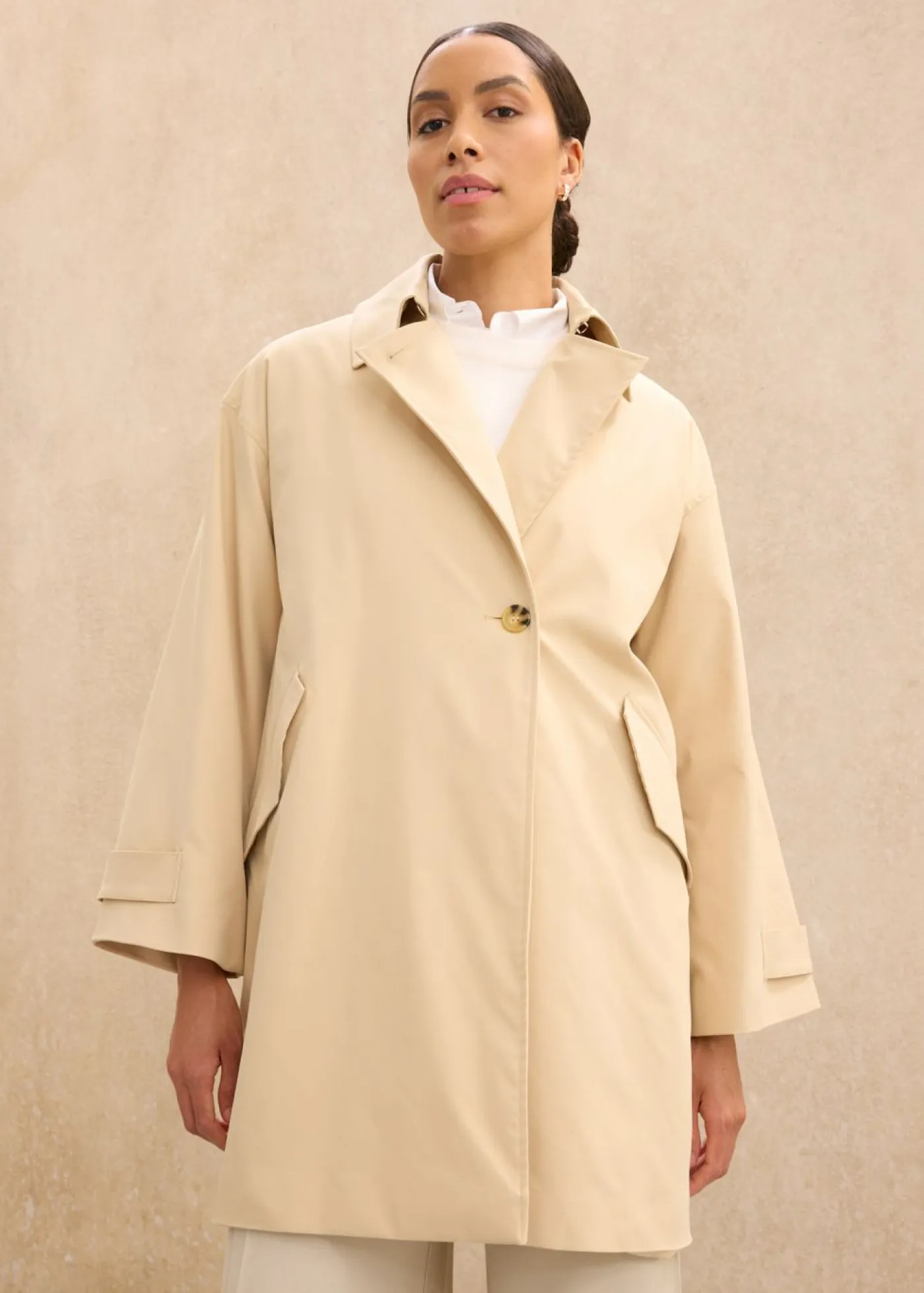 Trenca corta de una hilera de botones con mangas raglán y tapeta oculta, así como cierres abotonados en los extremos de las mangas.