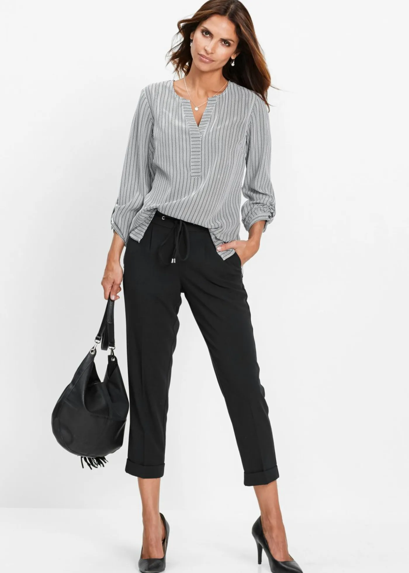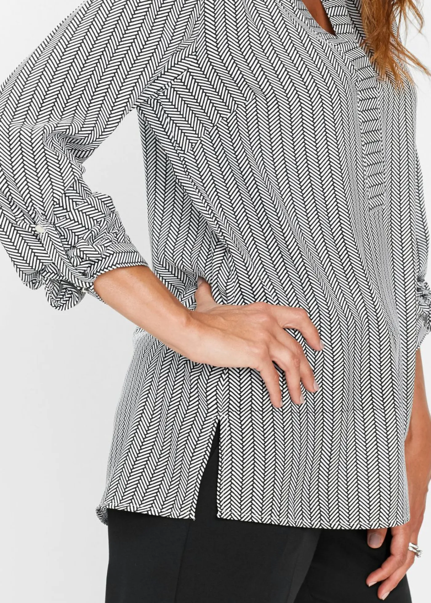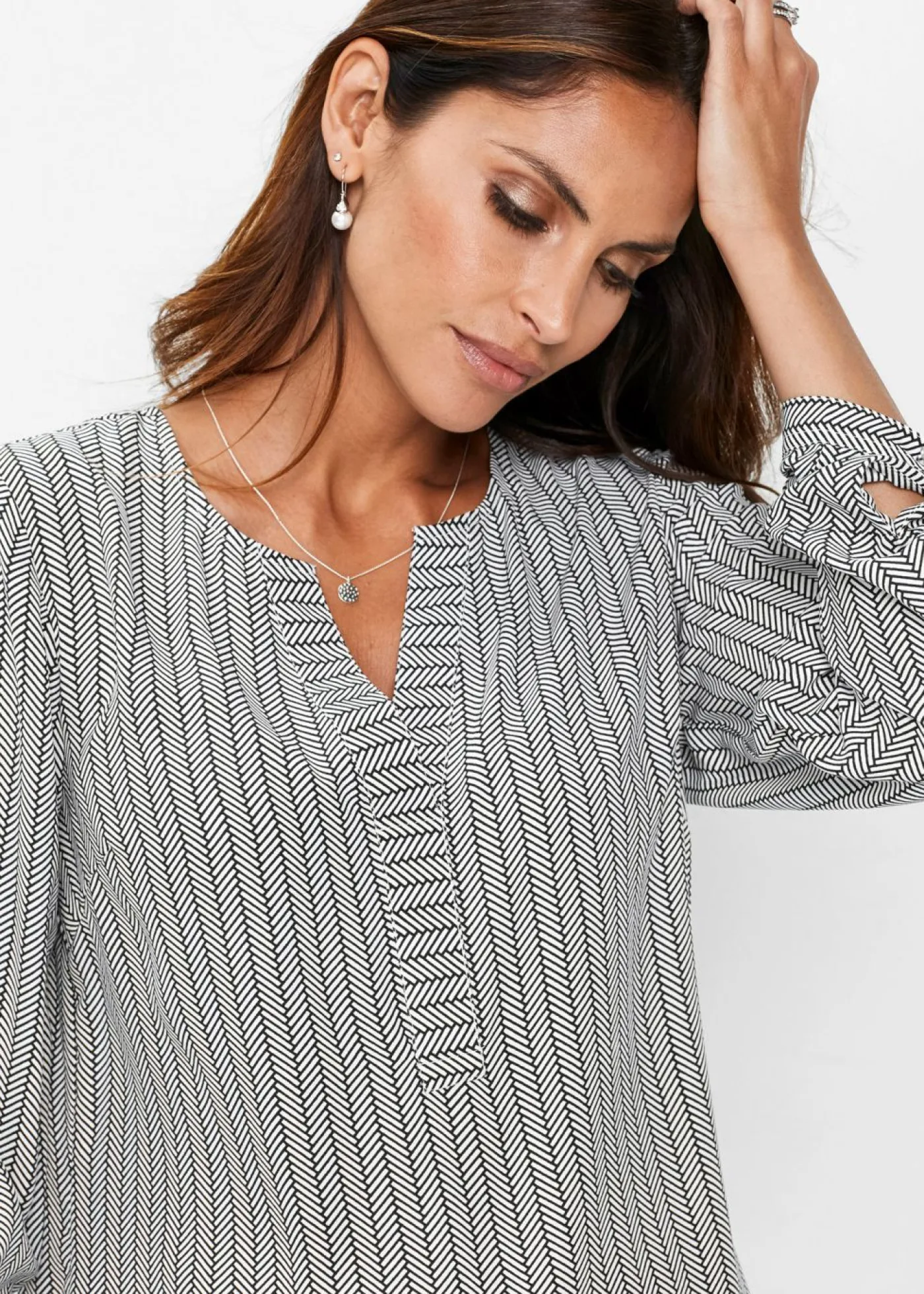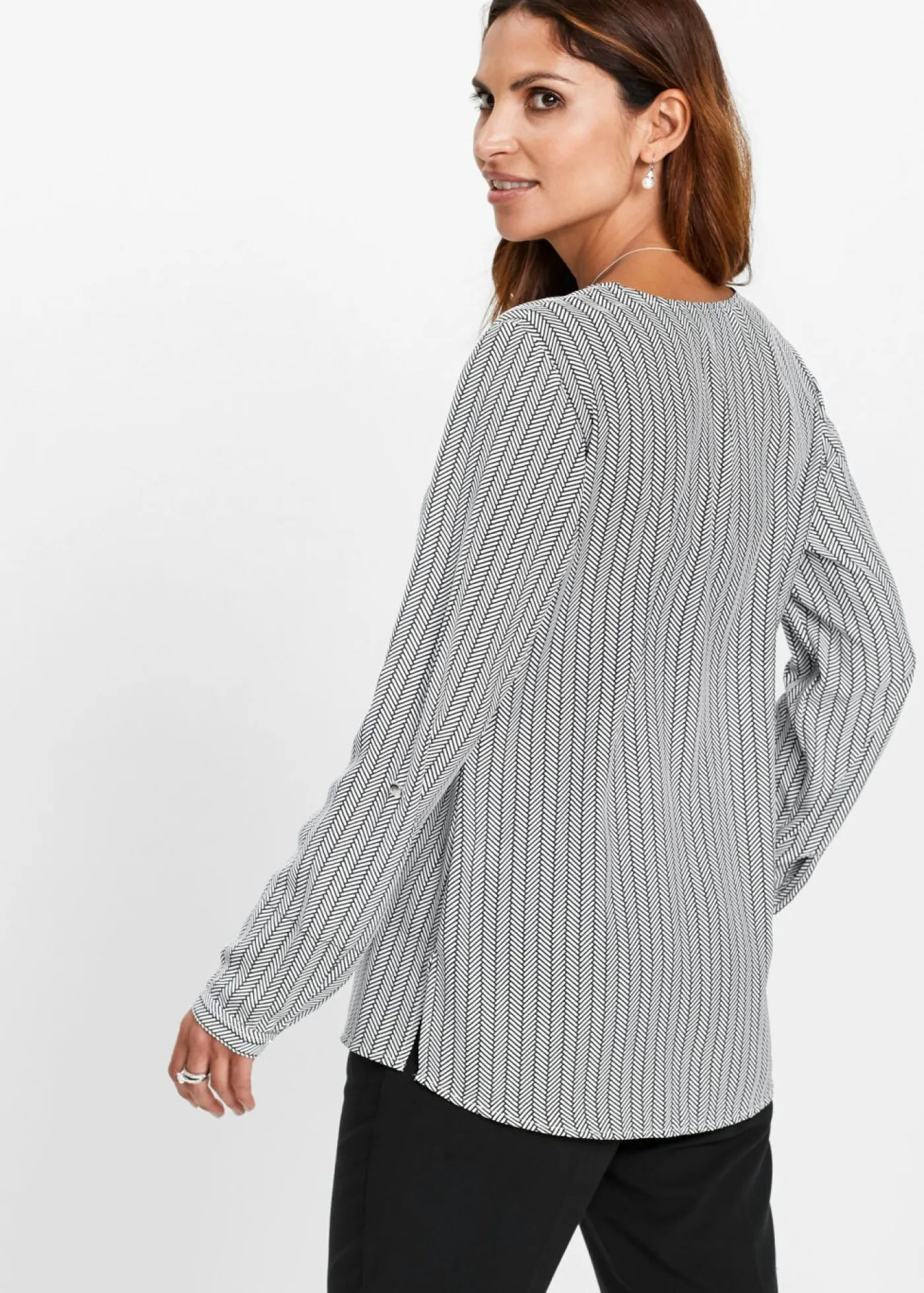 Blusa atemporal con escote en V. Más largo por detrás que por delante. Manga larga ajustable. Largo de aprox. 68 cm (talla 36) a aprox. 77 cm (talla 54). Se puede lavar a máquina.