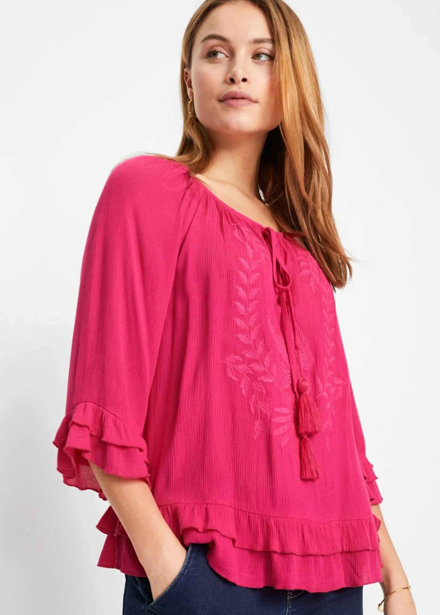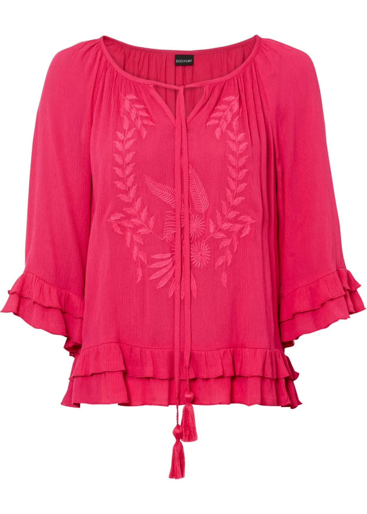 Femenina túnica con adornos y volantes. Bonita blusa con un look boho bordada con el mismo color. Los volantes en el dobladillo hacen que la blusa sea muy especial. Blusa con cuello redondo y cordones. Largo de aprox. 60 cm en talla 38.
