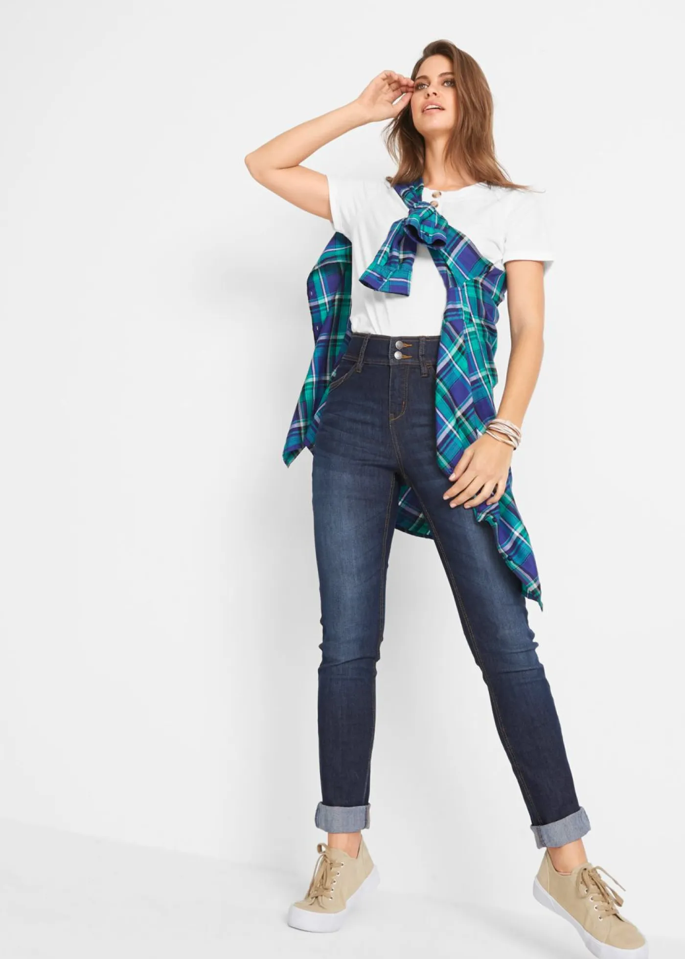 Vaqueros elásticos versátiles con cintura alta y bolsillos. Largo interior de la pierna de aprox. 79 cm en talla 42 (talla normal) y aprox. 74 cm (talla corta). Se puede lavar a máquina.