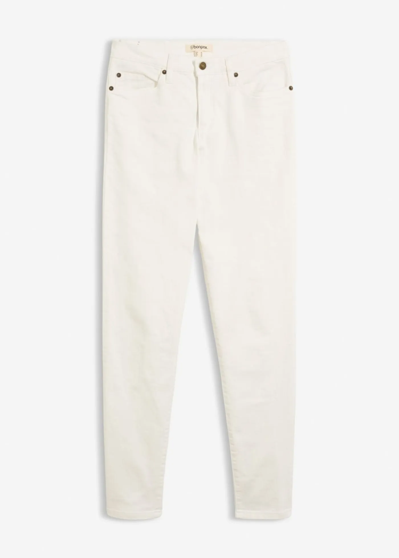 Vaqueros elásticos con corte mom y perneras ajustadas: ideales para el día a día. Se puede lavar a máquina. Largo interior de la pierna de aprox. en talla 42.