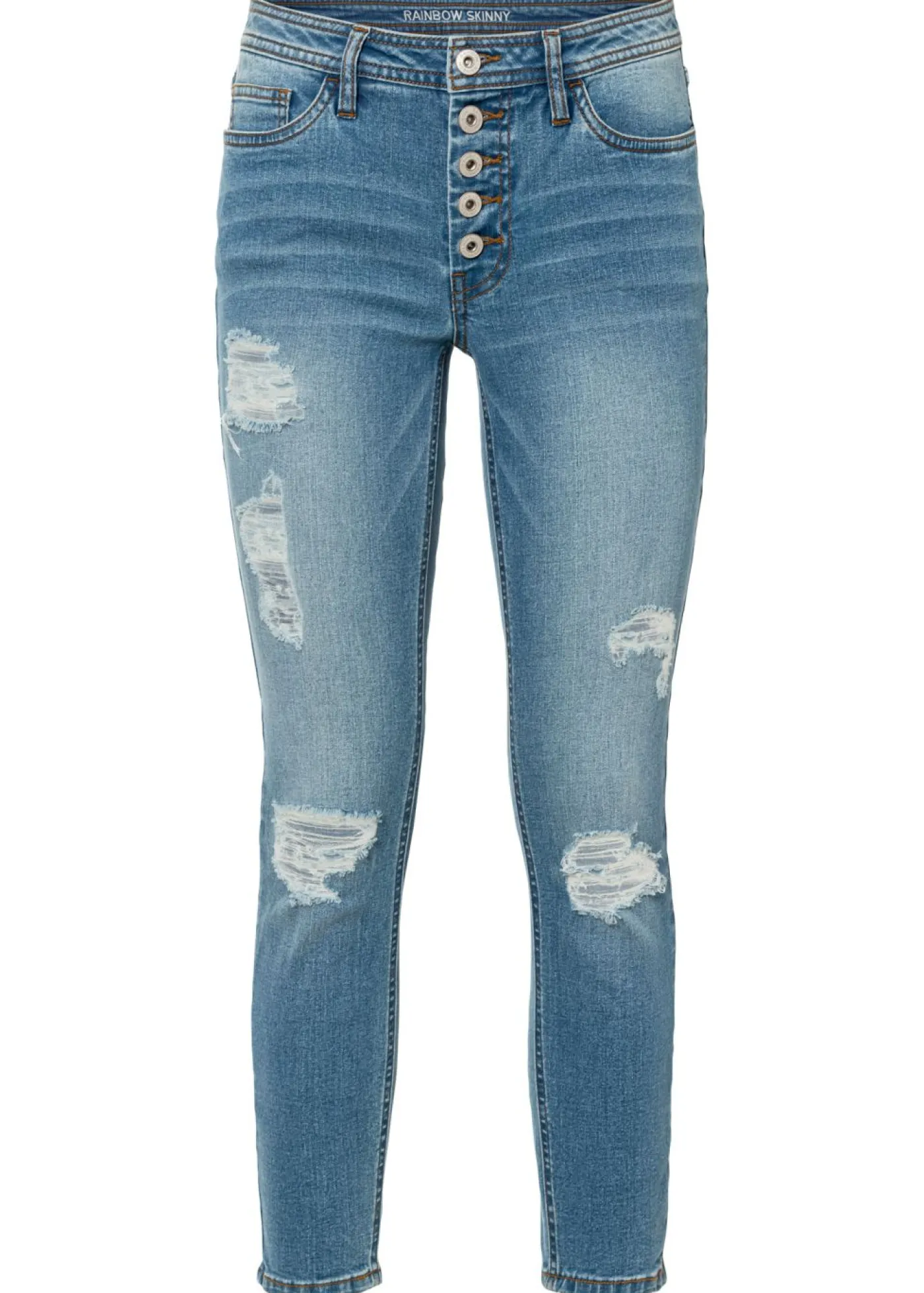 Vaqueros pitillo modernos con botones visibles.
