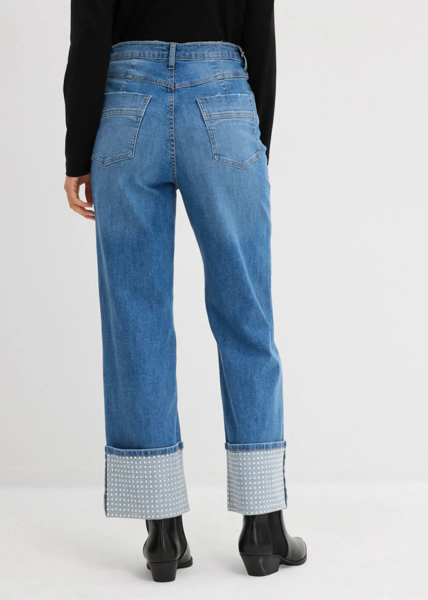Vaqueros rectos de talle alto con dobladillo decorado con piedras brillantes.