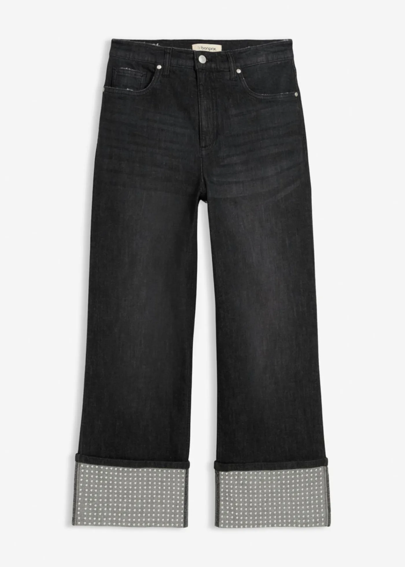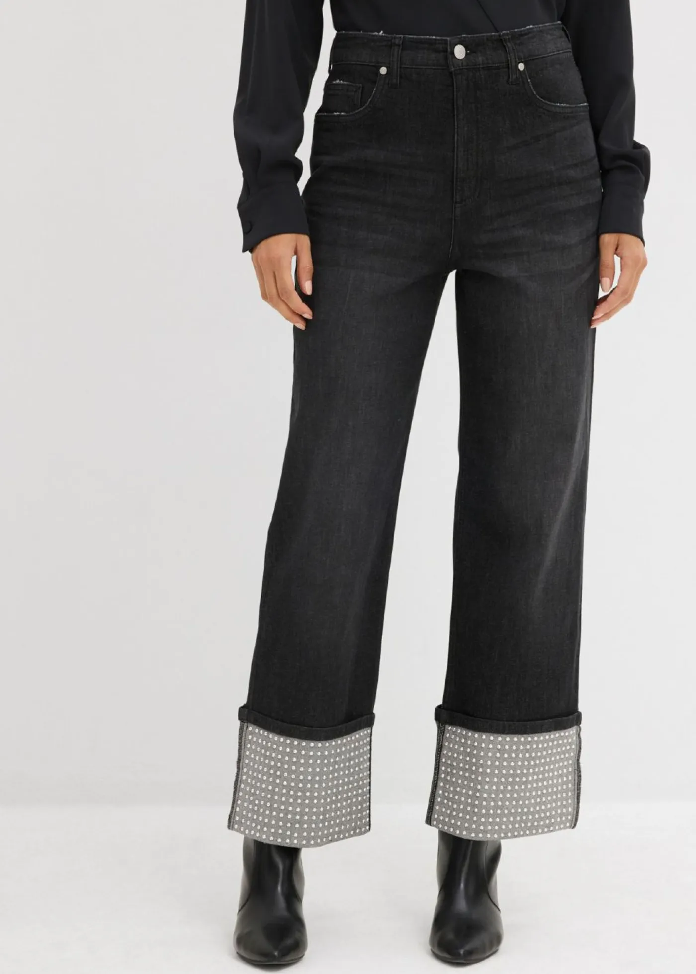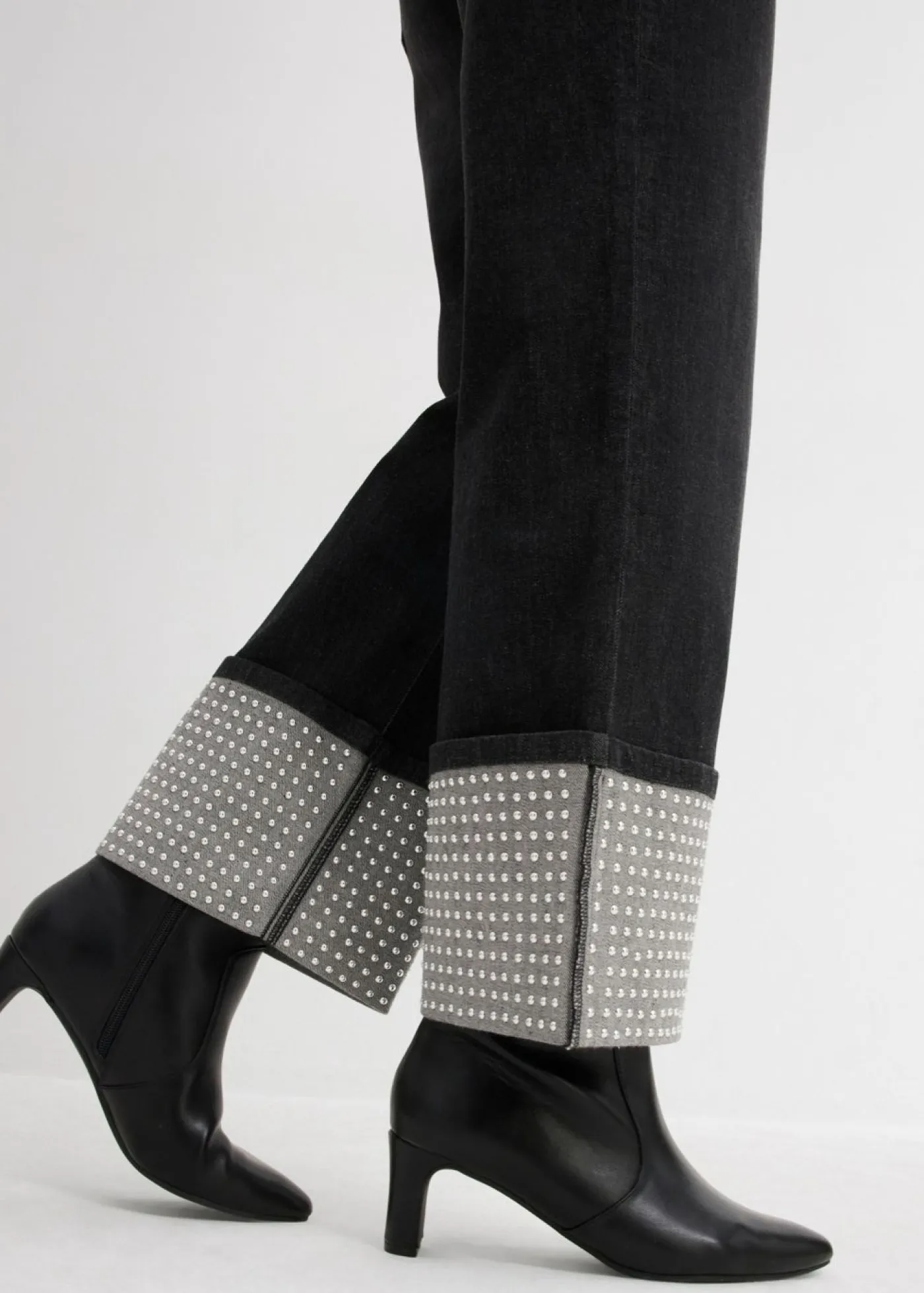 Vaqueros rectos de talle alto con dobladillo decorado con piedras brillantes.
