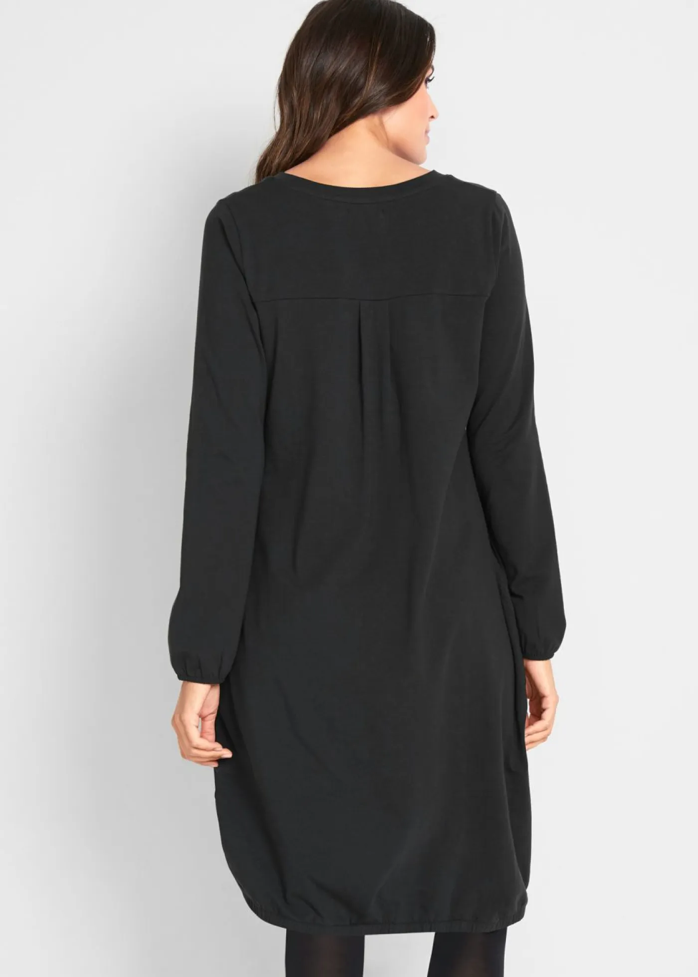 Vestido de punto con mangas largas, una favorecedora forma de globo y goma en el dobladillo. Largo de aprox. 106 cm en talla 40/42. Se puede lavar a máquina.