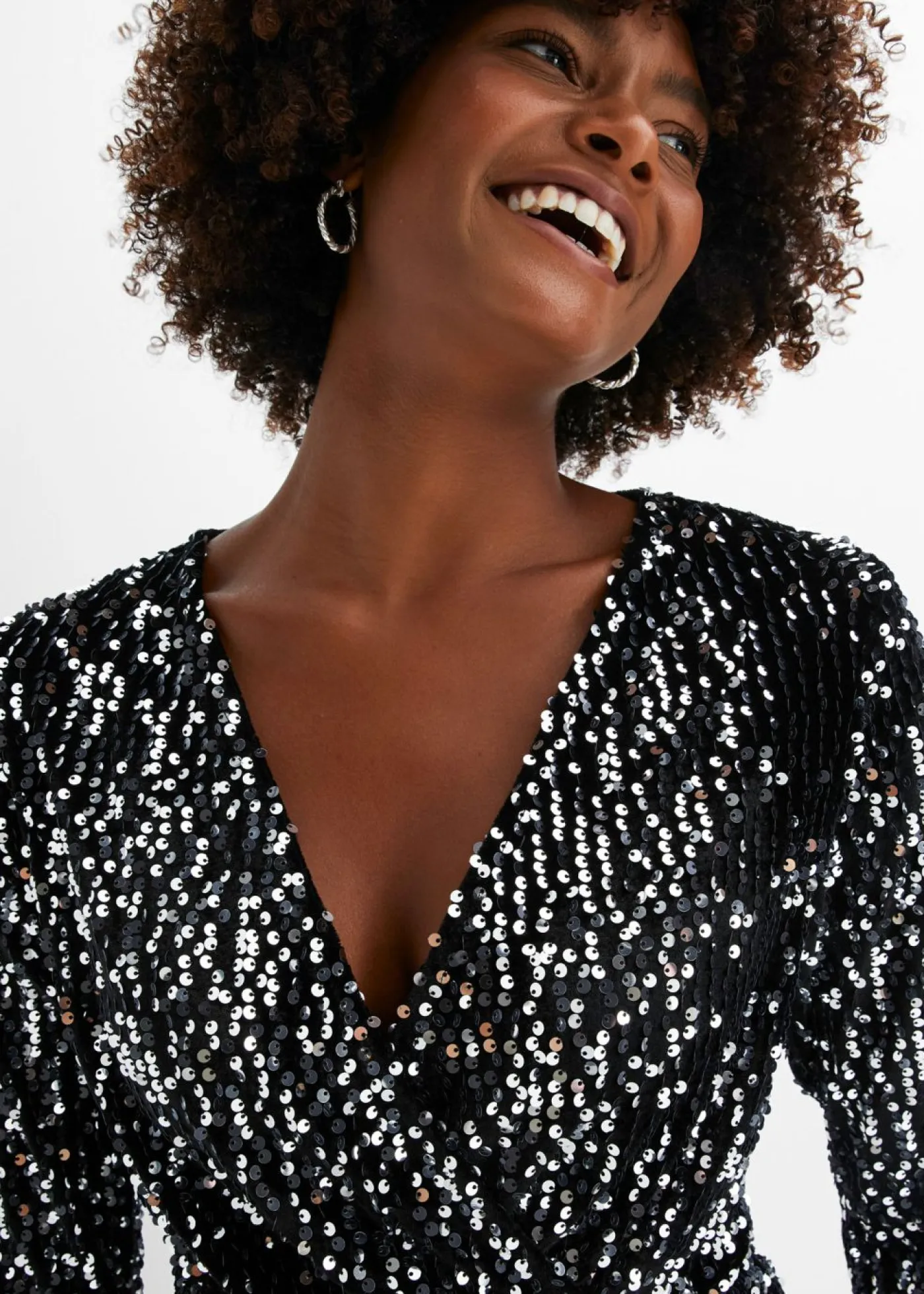 Moderno y femenino: Vestido de terciopelo con lentejuelas, diseño cruzado y volantes.