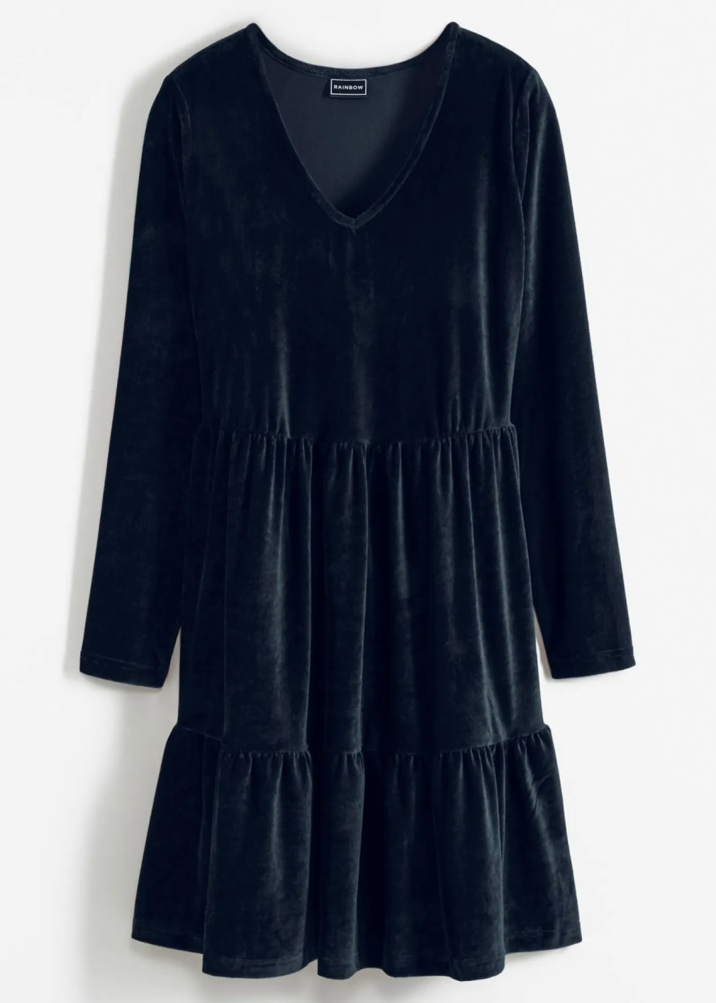 Divertido vestido de terciopelo con fruncidos. Largo de aprox. 96 cm en talla 40/42. Se puede lavar a máquina.