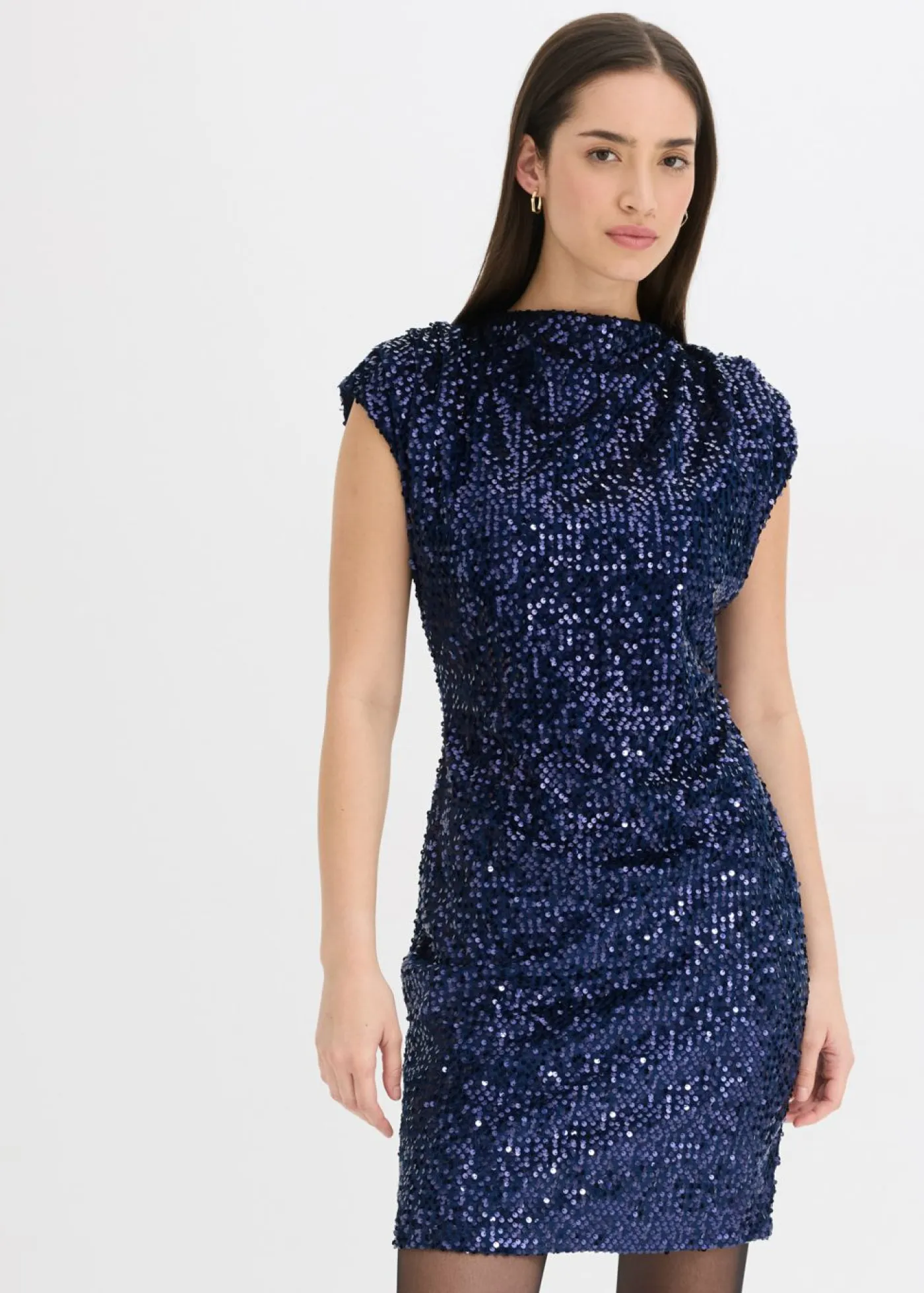 Vestido de lentejuelas ajustado con hombreras y detalle de fruncido en el hombro.