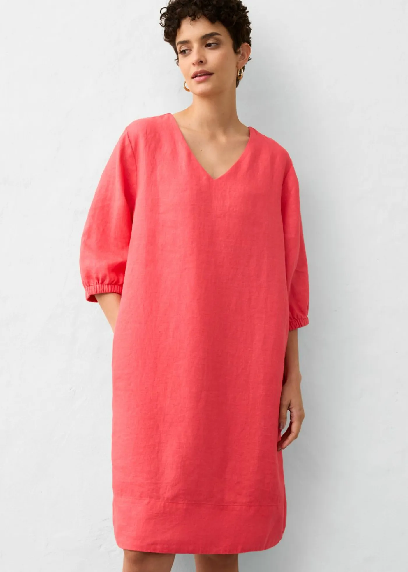 Vestido corto de lino con corte holgado y mangas raglán.