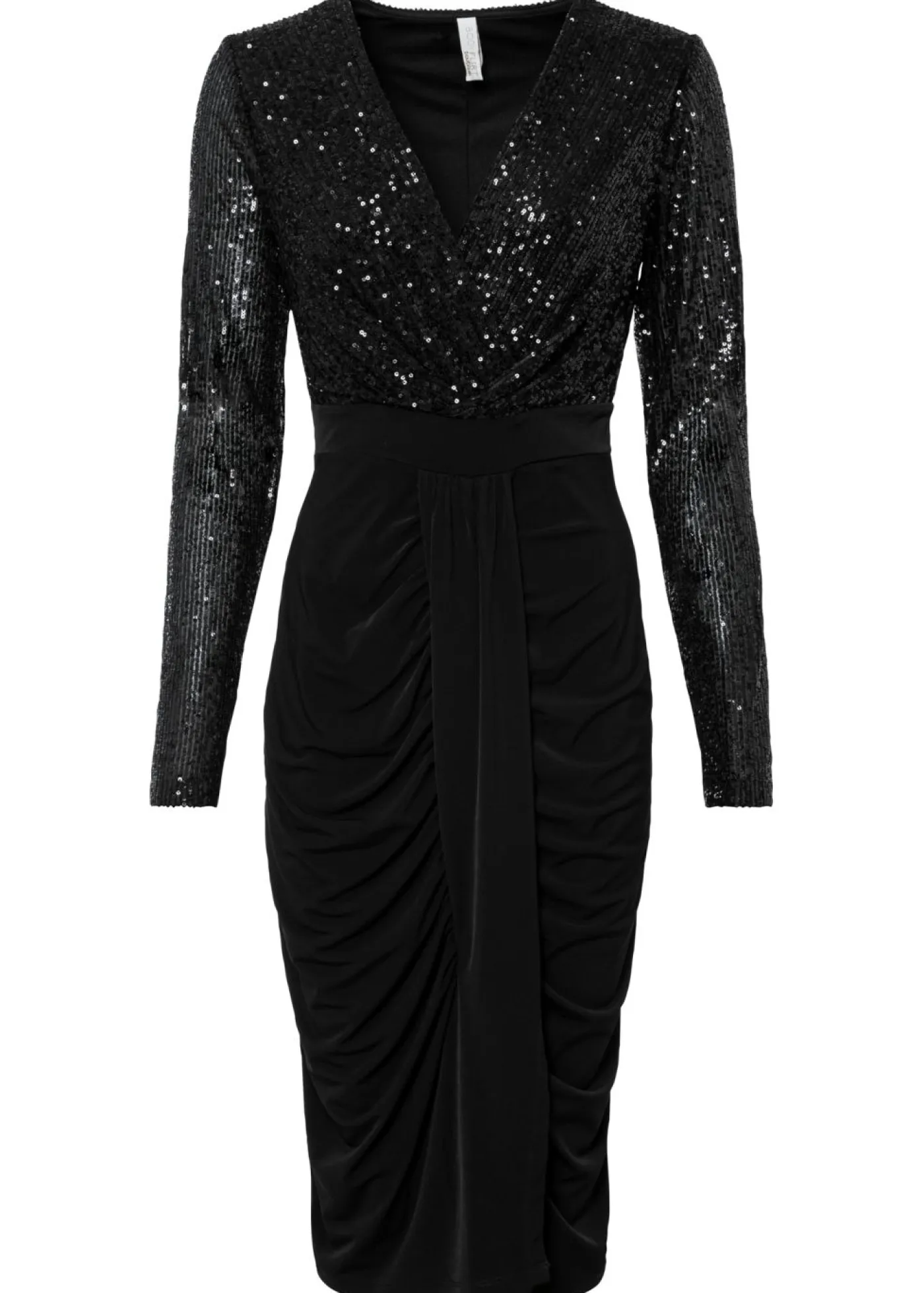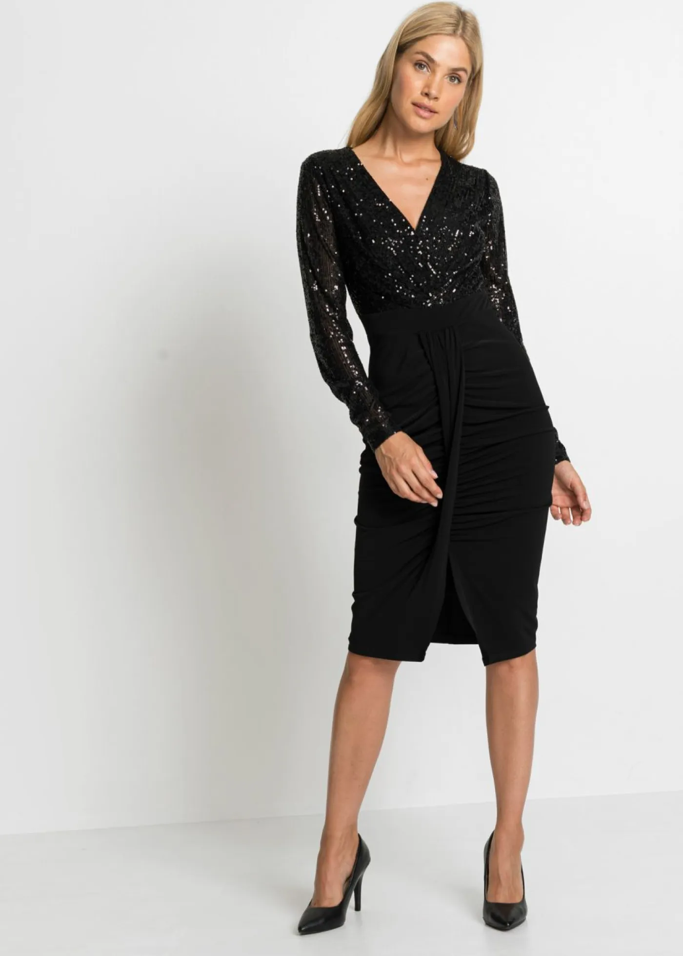 Femenino y festivo: vestido de lentejuelas con fruncido y drapeado en la falda.