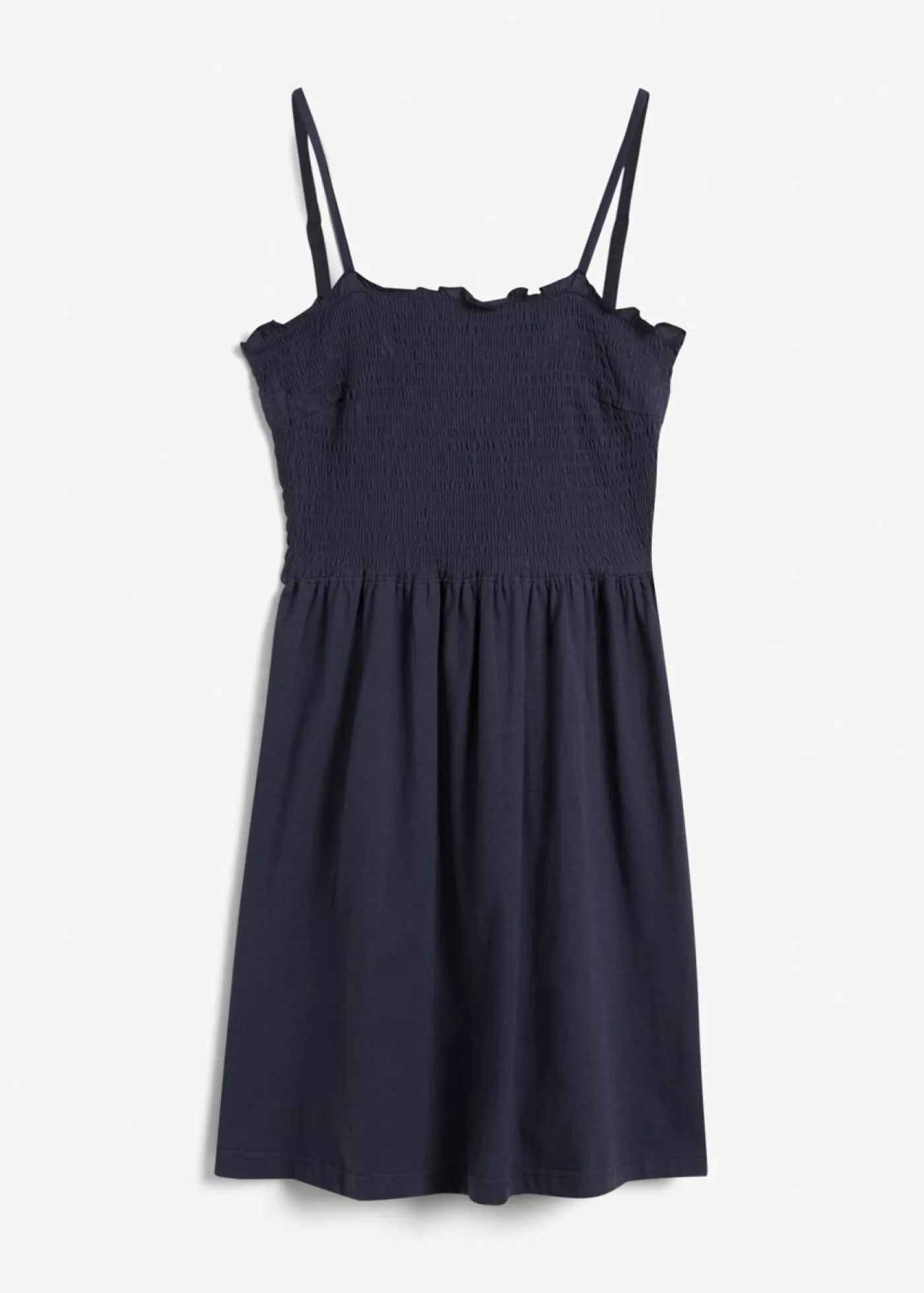 Cómodo vestido camisero de algodón con bonito nido de abeja y tirantes ajustables. Largo total de aprox. 90 cm en talla 40/42. Se puede lavar a máquina.