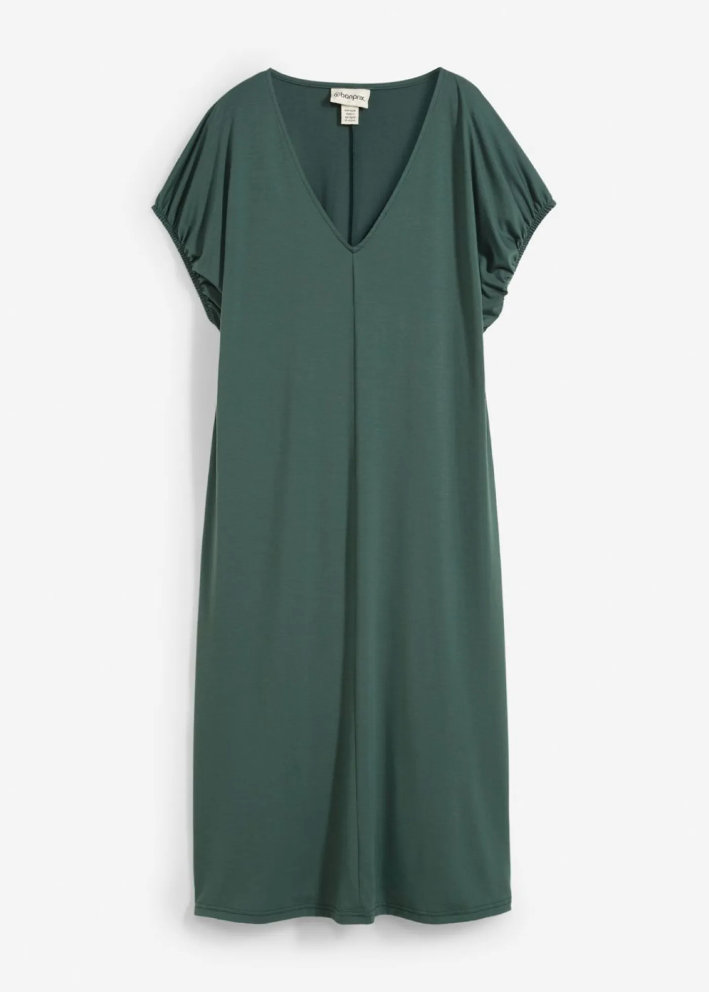 Vestido de manga corta con escote en V, bolsillos laterales y mangas abullonadas con puños elásticos.