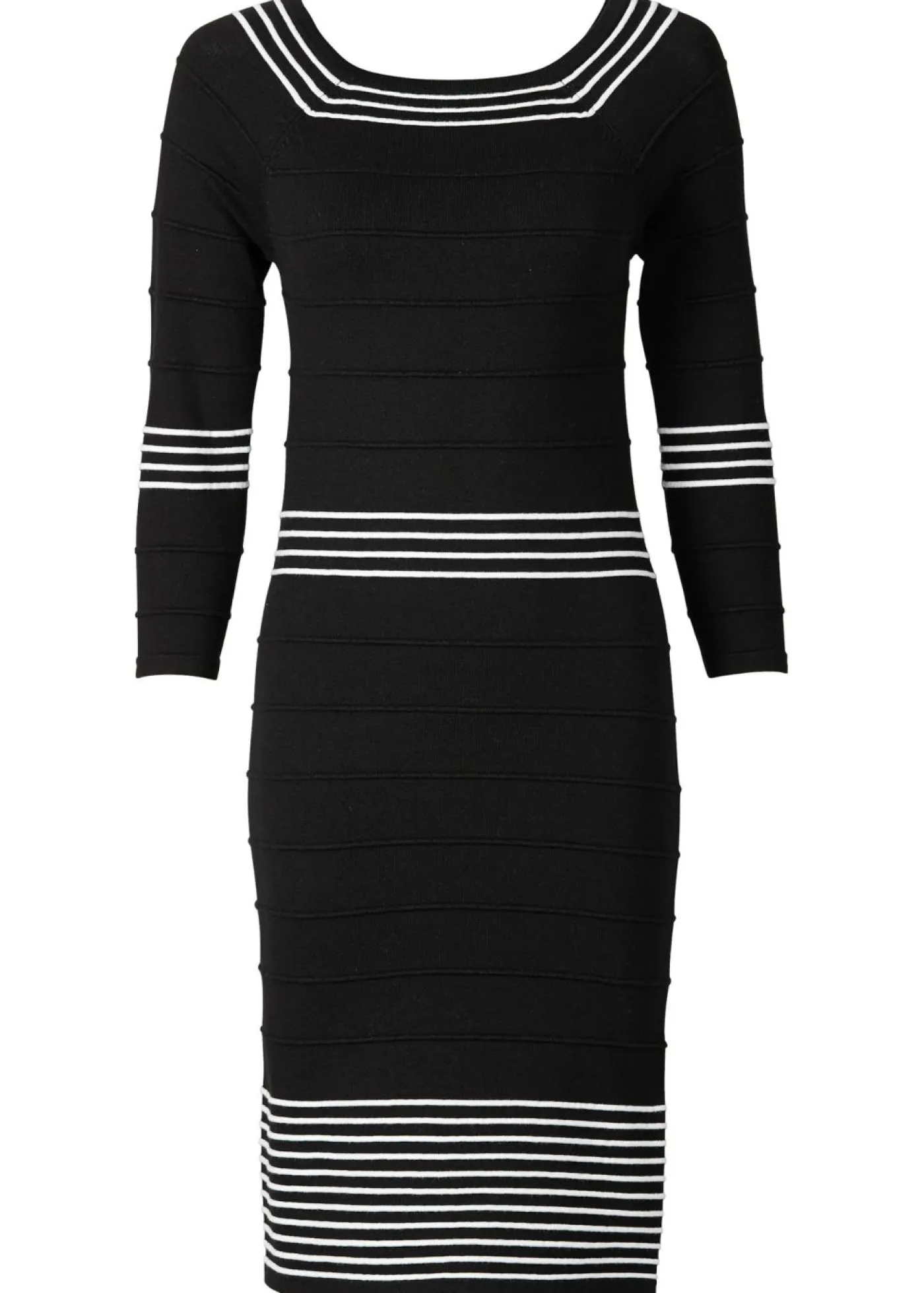 Atractivo vestido de punto con escote bañera. Vestido de punto suave con bonito escote bañera ribeteado con rayas como gran detalle. Las mangas 3/4 y las rayas en la cintura realzan la silueta. Largo de aprox. 90 cm en talla 36/38.