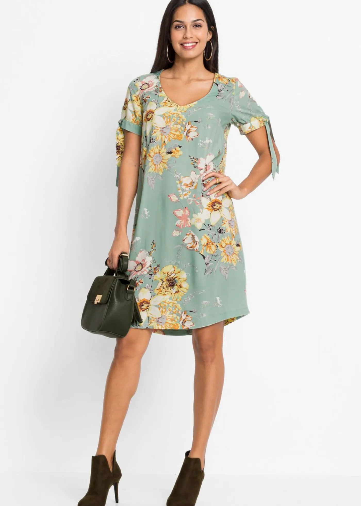 Moderno vestido de viscosa con un bonito estampado y cordones en las mangas.