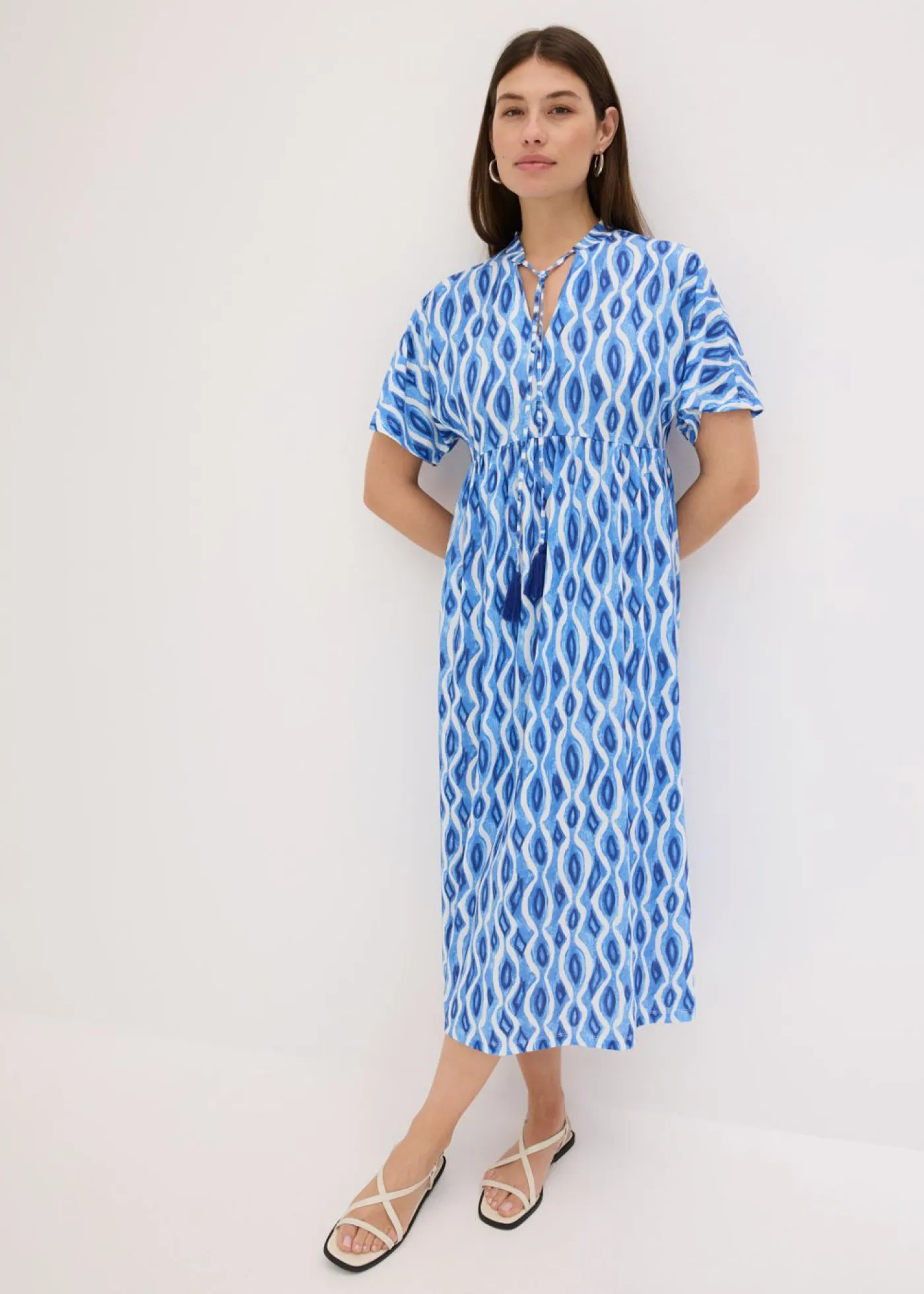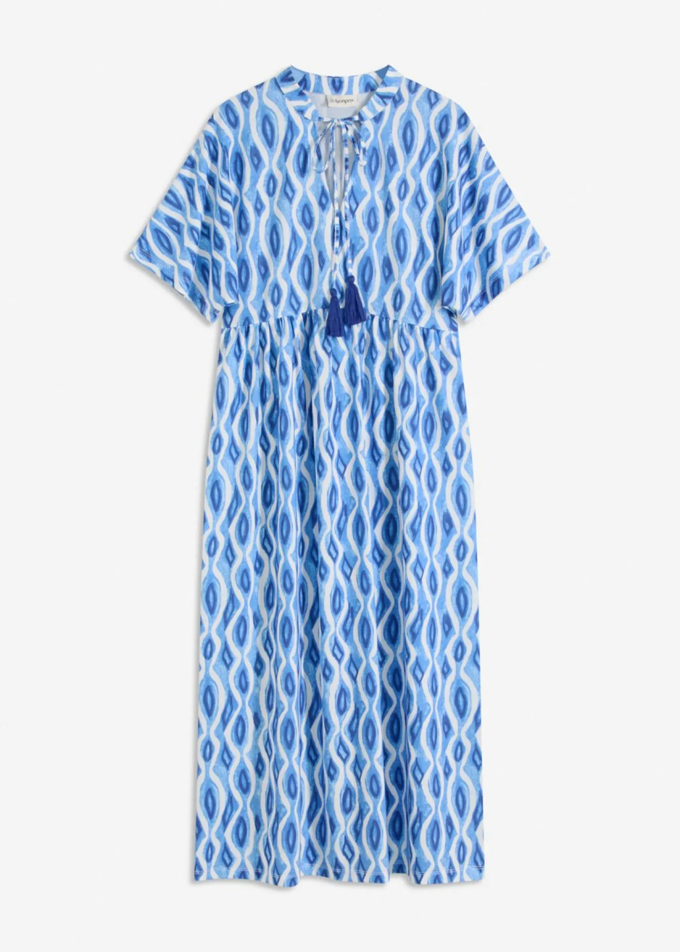 Vestido tipo túnica con estampado veraniego, largo midi, lazos en el escote delantero y mangas anchas.